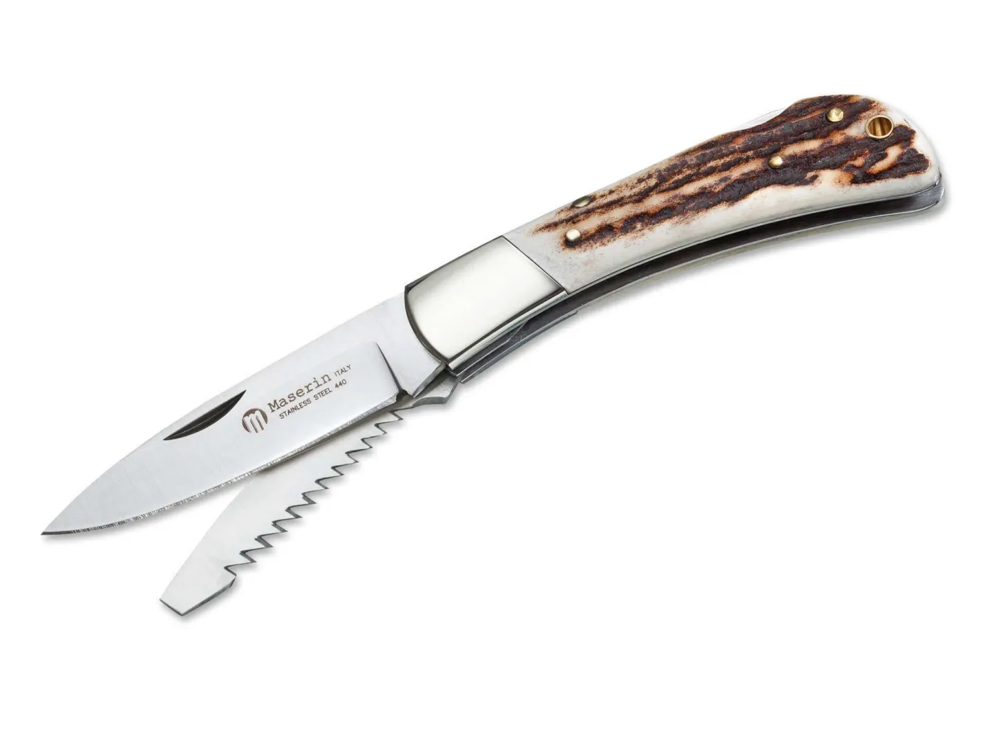 Im Bereich der traditionellen mehrteiligen Jagdtaschenmesser bietet Maserin mit dem Multiuso Caccia (Allzweckmesser für die Jagd) einen echten Klassiker. Mit Neusilberbacken, Hirschhornbeschalung, Hauptklinge und Säge.