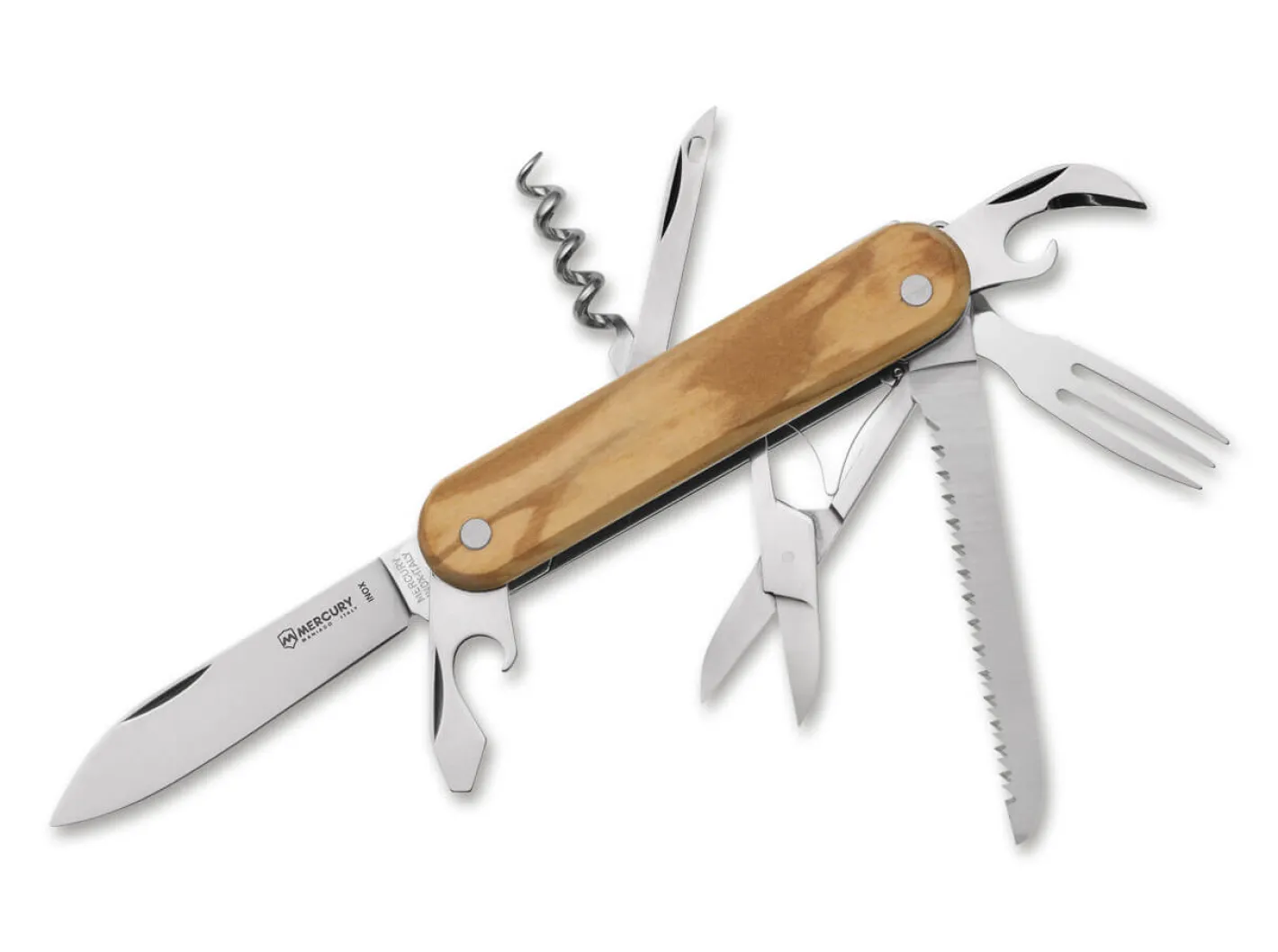 Das Mercury 913-8LC setzt auf Understatement und punktet mit seiner eleganten Schlichtheit. Das klassische Messer öffnet die Klinge aus 420 per Nagelhau und verriegelt nicht. Korkenzieher, Kapselheber, Dosenöffner, Ahle, Gabel, Säge und Schere machen das Slipjoint Messer zu einem unverzichten Begleiter für den Alltag. Guten Halt versprechen die balligen Griffschalen aus Olivenholz. Mit Fangriemenöse.