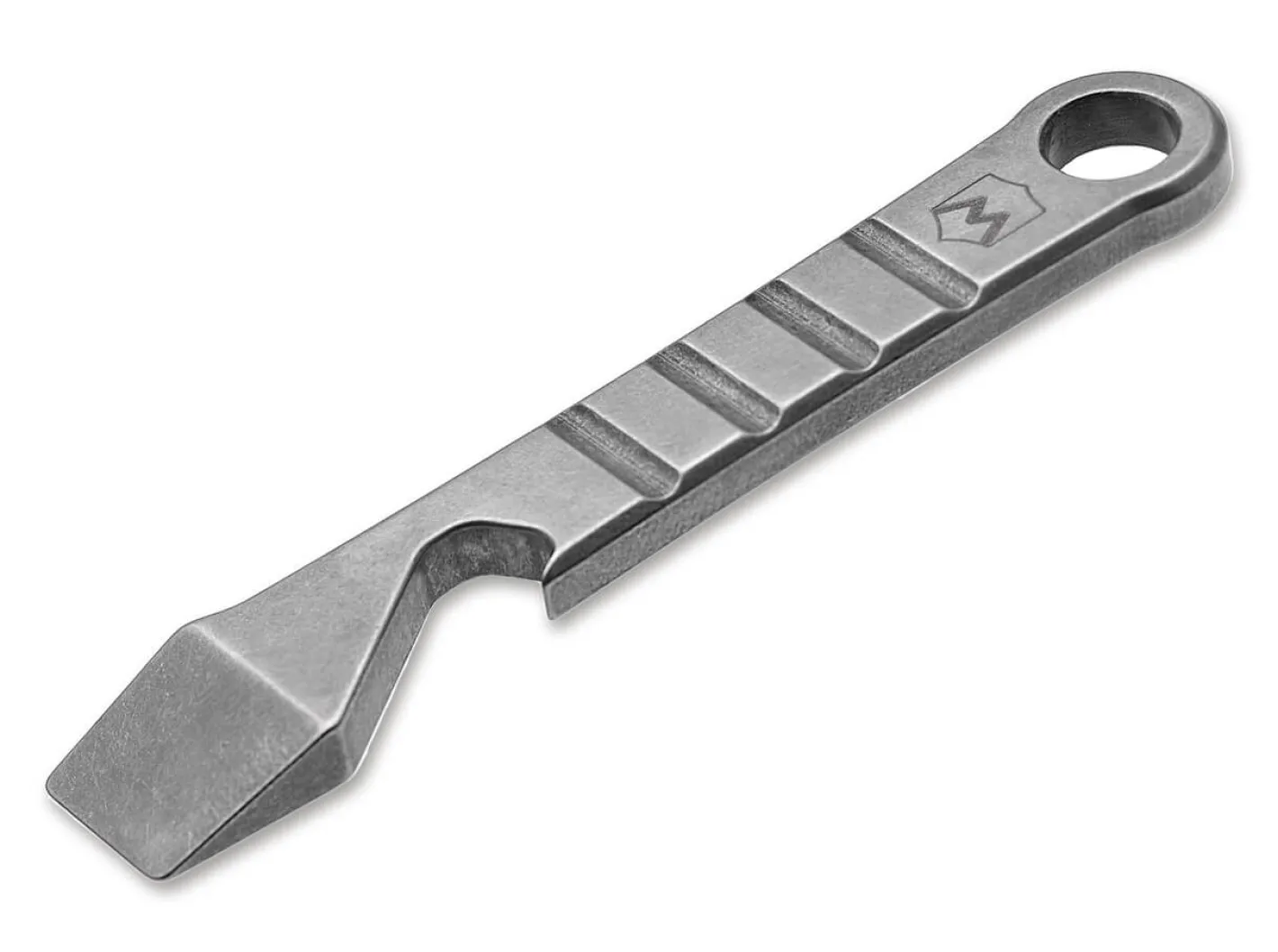Kompaktes Tool aus 4116 zum Hebeln und Stemmen. Mit rustikalem Stonewash-Finish und Fangriemenöse zur Befestigung zur Befestigung am Schlüsselbund.