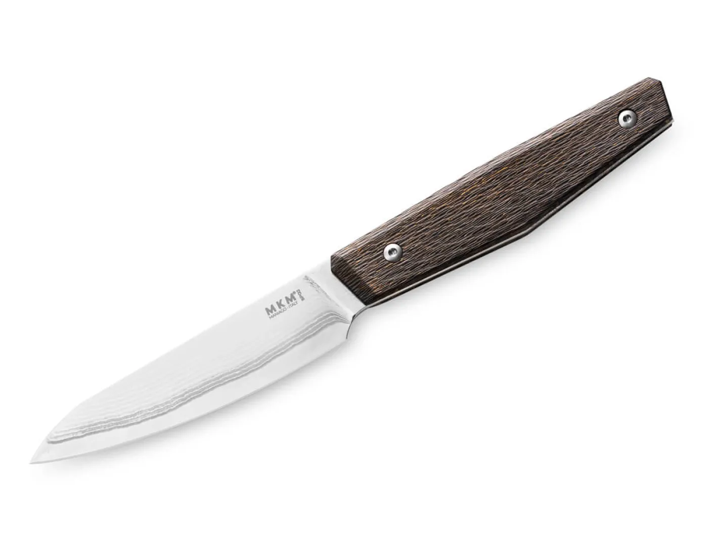 Der bekannte Messerdesigner Jens Anso greift zu Kochlöffel und Zeichenbrett und zaubert Gourmets mit der MKM Prima Serie ein vollmundiges Menü feinster Kochmesser auf den Tisch. Das Gemüsemesser eignet sich ideal zum Schneiden und Zerkleinern von Gemüse und Obst. Auch zum Schälen oder als kleines Allzweckmesser in der Küche ist das Gemüsemesser oft die bevorzugte Wahl vor dem großen Chefmesser. In dieser besonderen Version ist das MKM Prima Gemüsemesser mit einer edlen Takefu Damast-Klinge mit 65 Lagen bei einer Härte von 61-63 HRC ausgestattet. Typisch Anso gestaltet sich der Griff aus gold-schwarzem FAT-Carbon, der übliche Konventionen zu Gunsten moderner, kantiger Linien ausklammert.