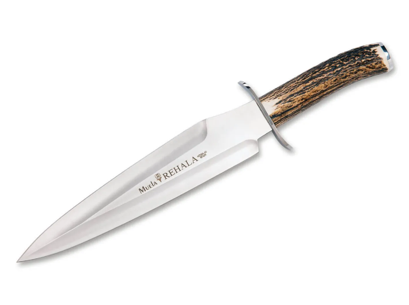 Der wuchtige Hirschfänger Rehala-27A hat eine Klinge aus Nitro-42 Stahl, welcher durch seinen erhöhten Kohlenstoff- und Stickstoffgehalt eine außerordentliche Härte mit einer hohen Korrosionsbeständigkeit vereint. Der anmutige Griff aus Hirschhorn ist mit einer geschwungenen Parierstange aus Edelstahl ausgestattet. Mit hochwertiger Lederscheide.