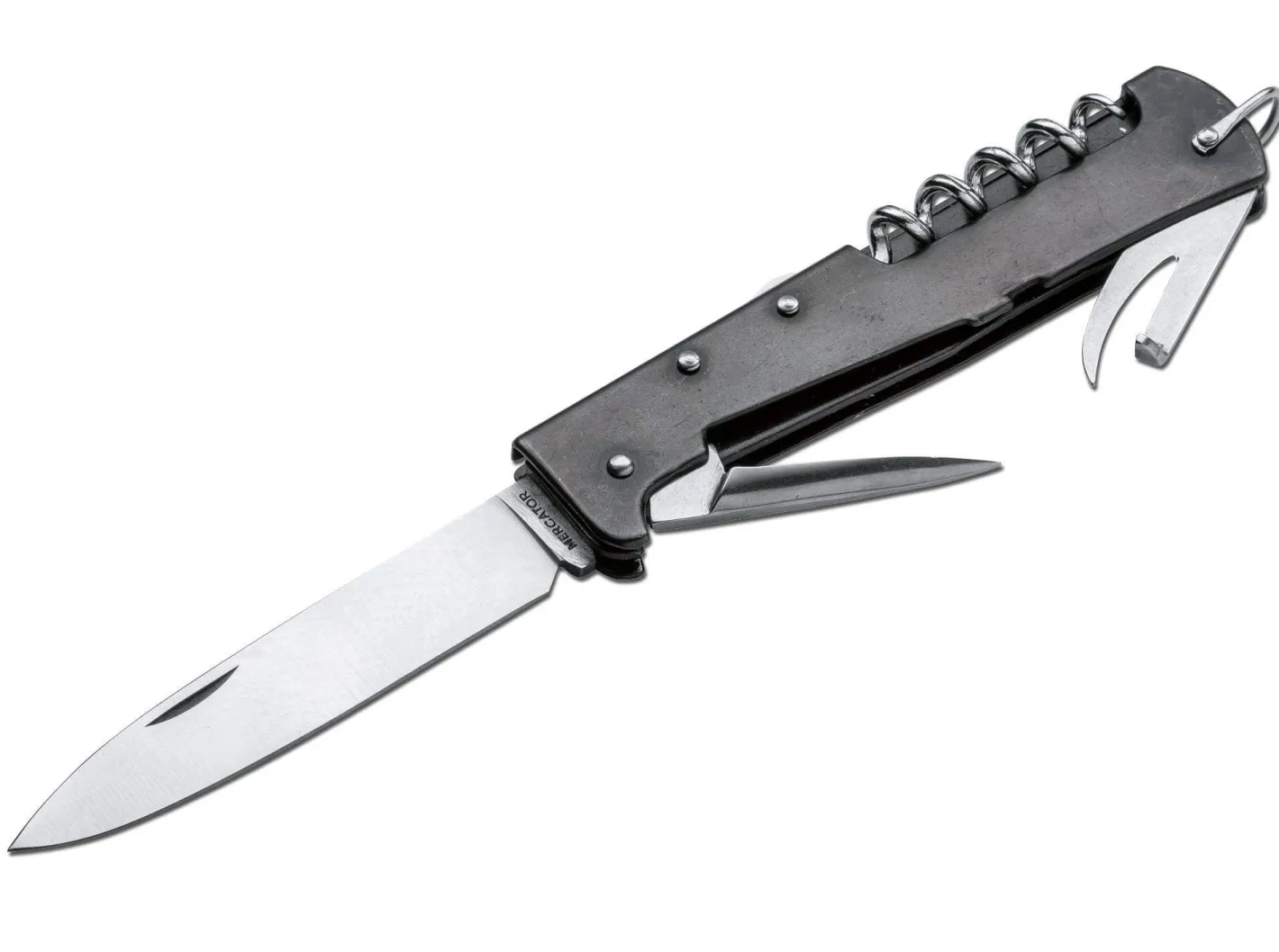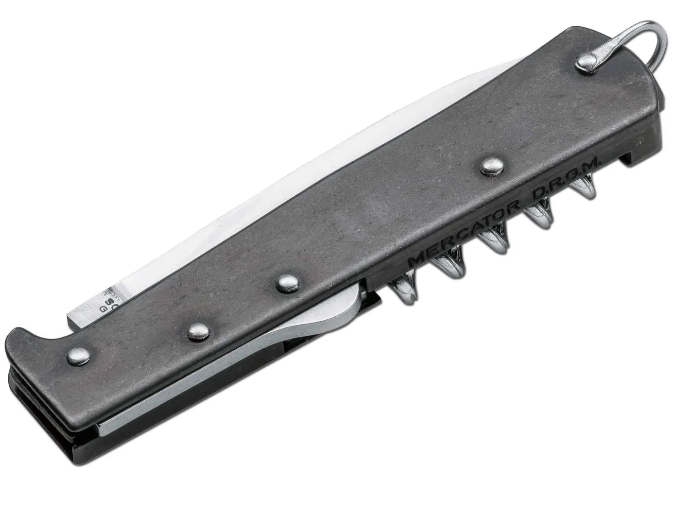 Der große Bruder des berühmten Mercator-Messers, ausgestattet mit vier Werkzeugen. Neben der im Backlock arretierbaren Klinge ist das Modell mit einem großen Korkenzieher ausgerüstet, der eine sogenannte „Seele“ im Wendel besitzt. Die durchlaufende Nut verhindert, dass der Korken beim Ziehen zerbricht. Außerdem freut sich der Anwender über eine Ahle zum Lösen von Knoten oder zum Stechen von Löchern sowie einen Dosenöffner. Ahle und Dosenöffner werden auf Riemenfallhämmern geschmiedet und anschließend vor- und feingeschliffen. Die Klinge besteht aus dem nicht rostfreien Kohlenstoffstahl C75 und hat eine gepließtete Oberfläche. Der Metallkasten des Griffs besteht aus brüniertem Stahl und verleiht dem Messer die Aura eines zeitlosen Qualitätsprodukts, das in über 120 Arbeitsschritten von Hand gefertigt wird. Inkl. Metallöse am Griffende und Originalstempelung im Griffrücken „Mercator D.R.G.M.“ (Deutsches Reich Gebrauchs Muster).Leider kam es bei diesem Artikel im aktuellen Katalog zu einem Preisfehler. Gültig ist der hier angezeigte Preis. Wir bitten den Druckfehler im Katalog zu entschuldigen und danken für Ihr Verständnis.