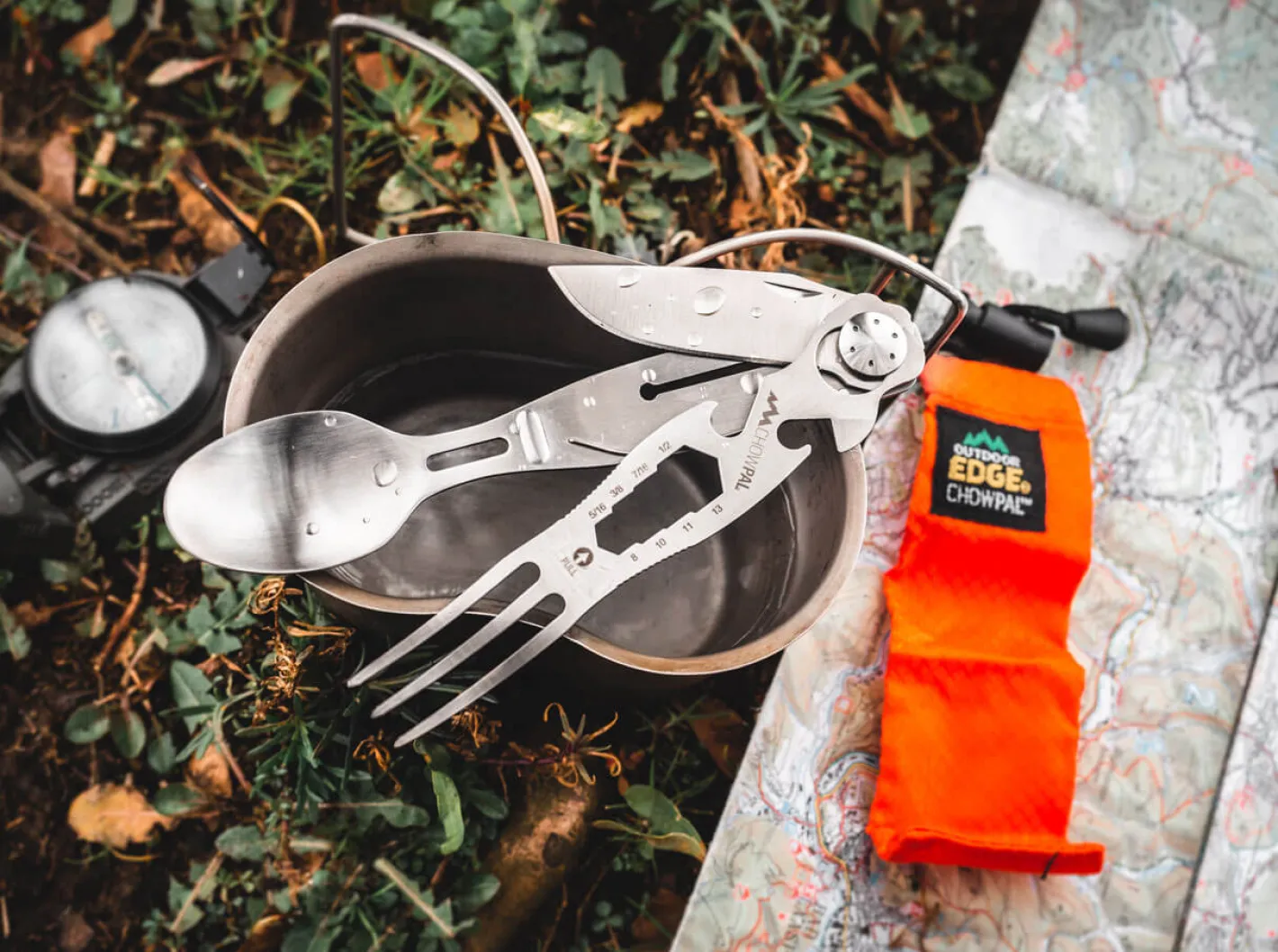 Das Chow Pal von Outdoor Edge fügt sich nahtlos ein in Reihe der immer durchdachten und unbedingt praxistauglichen Produkte aus der Ideenschmiede Outdoor Edge. Es ist mit seinen 68 Gramm nicht nur ungewöhnlich flach und leicht für ein vollständig mit Messer, Gabel und Löffel ausgestattetes Outdoor-Besteck. In die Gabel mit langen Zinken sind zusätzlich ein Sechskantschlüsselsatz mit vier Größen, ein Dosen- und ein Flaschenöffner integriert. Das Set aus amerikanischem 420J2-Edelstahl kann durch einen genialen Mechanismus platzminimierend ineinandergesteckt werden. Das Ganze kann hygienisch im mitgelieferten Nylonbeutel mit Kordelzug transportiert werden. Selbst Ultralight-Trekker geraten angesichts dieser Eckdaten in Versuchung, ihr Titan- oder Kunststoff-Besteck aus der Ausrüstung zu verbannen.