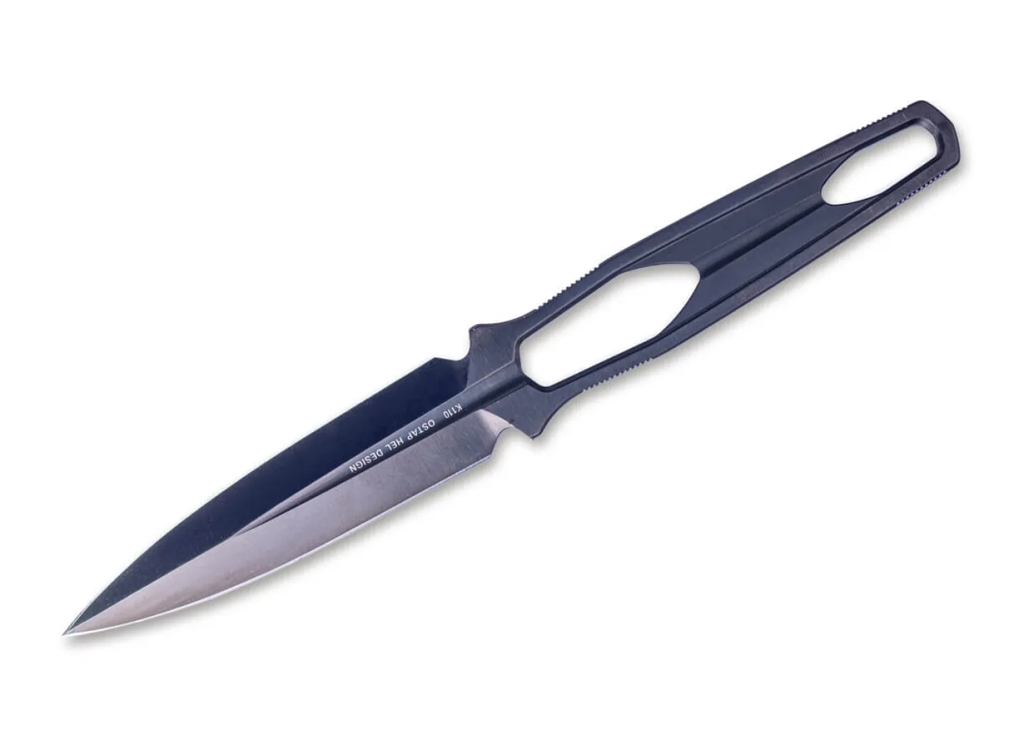 Der taktische Dolch aus der Feder von Ostap Hel ist mit einer beidseitig abgezogenen Spearpoint-Klinge aus K110 sowie einem schwarzen DLC-Finish zum Schutz vor Kratzern und zur Verminderung von Reflexionen. Geliefert wird das als Ganzstahlkonstruktion konzipierte Skelettmesser in einer passgenauen Kydexscheide.