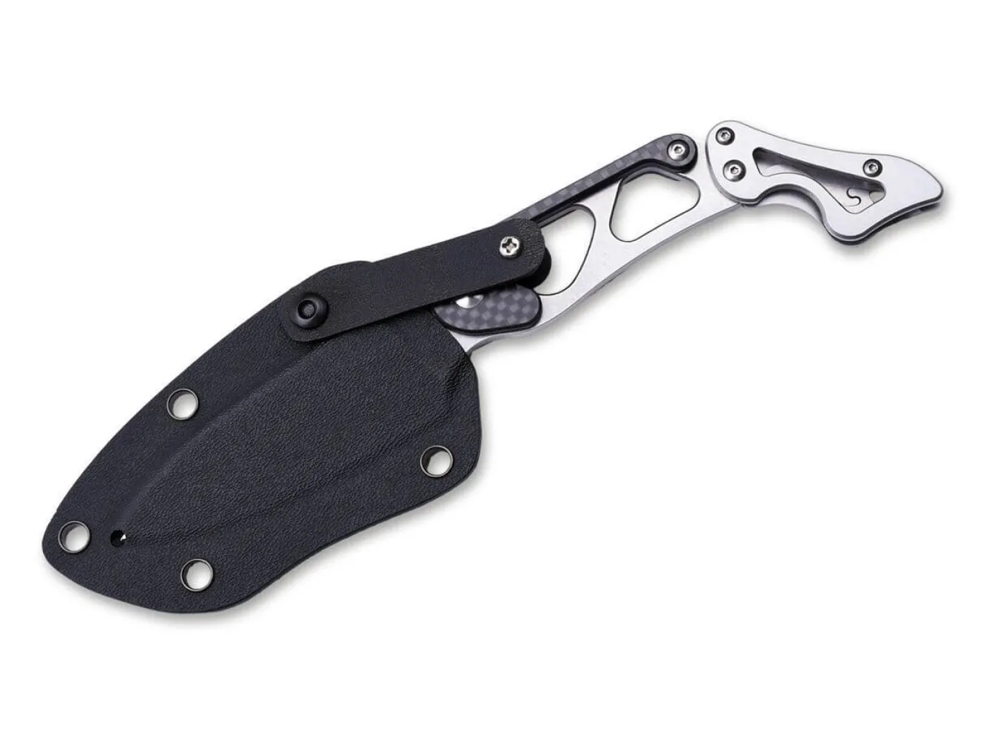 Das weiterentwickelte Cormorant Apex von Real Steel ist ein innovatives feststehendes Messer, das aufgrund des variablen Griffs mit einem breiten Einsatzspektrum glänzt. Das kompakte Messer kann problemlos als leichtes EDC oder auch Neck Knife getragen werden, bietet mit ausgeklappter Verlängerung aber die komfortable Handlage eines deutlich größeren Messers. Gefertigt wird die Ganzstahlkonstruktion mit Stonewash-Finish aus 14C28N, der skelettierte Griff mit Schalen aus Kohlefaser reduziert das Gewicht zusätzlich. Mit praktischer Kydex-Scheide.