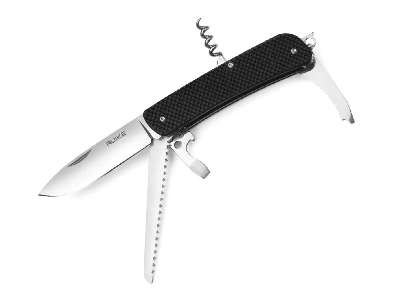 Mit großer Klinge und robusten Werkzeugen ist die Ruike L-Serie für alle Arten von Outdoor-Aktivitäten und den Notfallgebrauch geeignet. Die 8,5 cm lange polierte Klinge aus Sandvik 12C27 Edelstahl weist eine erweiterte Stärke und Breite auf und erreicht so eine längere Lebensdauer und vielseitigere Einsatzmöglichkeiten. Der Griff aus schwarzem strukturiertem G10 liegt sicher und angenehm in der Hand und ist ideal für eine jahrelange Benutzung. Zusätzlich verfügt es über einen Korkenzieher, Schraubendreher, Flaschenöffner, Drahtabisolierer, kleinen Schraubendreher, Drahtbieger, Schneidhaken, einer Pinzette und Säge. Der Glasbrecher aus Wolframstahl ermöglicht dem Nutzer Glas oder andere robuste Materialien zu zerbrechen. Geöffnet wird das Messer per Nagelhau und gehalten wird es mit Hilfe eines Slipjoints. Mit Öse, Schlüsselring und Tip-down Clip.