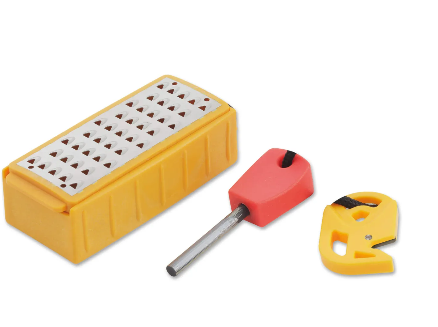 Mit dem Tinder Maker lässt sich schnell und einfach ein Feuer entfachen. Mit der Raspel erzeugen Sie ganz einfach Holzspäne als Zunder, die im Sammelbehälter bis zum Gebrauch windsicher aufbewahrt sind. Mit dem mitgelieferten Feuerstarter und Striker lässt sich der erzeugte Zunder dann mühelos in Brand setzen. Mit Fangriemen und Öse. Maße Raspel 7,8 cm x 3,6 cm x 2,4 cm.