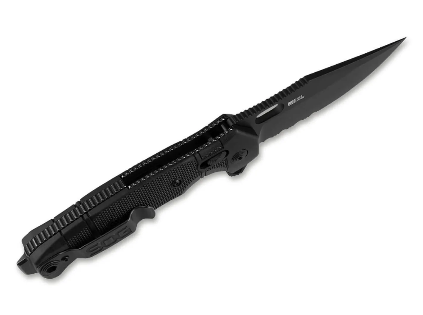 Das SEAL XR von SOG wurde in Zusammenarbeit mit professionellen Einsatzkräften entwickelt, getestet und optimiert. Das stabile Taschenmesser steht den feststehenden SEAL Modellen in Bezug auf Sicherheit und Funktionalität in nichts nach und überzeugt insbesondre mit hoher Korrosionsbeständigkeit und hervorragender Schnitthaltigkeit. Die Klinge wird per Daumenöffnung oder Flipper geöffnet und durch den zuverlässigen XR-Lock gesichert, der über den seitlichen Schieber im Griff leicht und komfortabel zu bedienen ist. Die schwarze Klinge mit Teilwellenschliff wird aus pulvermetallurgischen CPM-S-35VN gefertigt und ist mit einer widerstandsfähigen Cerakote- Beschichtung versehen. Der Griff besteht aus rutschfestem, strukturiertem GRN und liegt stets sicher in der Hand, das hervorstehende Griffende ist als Hammerfläche ausgeformt. Zusätzliche Riffelungen am Klingen- und Griffrücken erhöhten die Arbeitssicherheit. Mit umsetzbarem Clip (Tip-up/l-r). Made in USA.