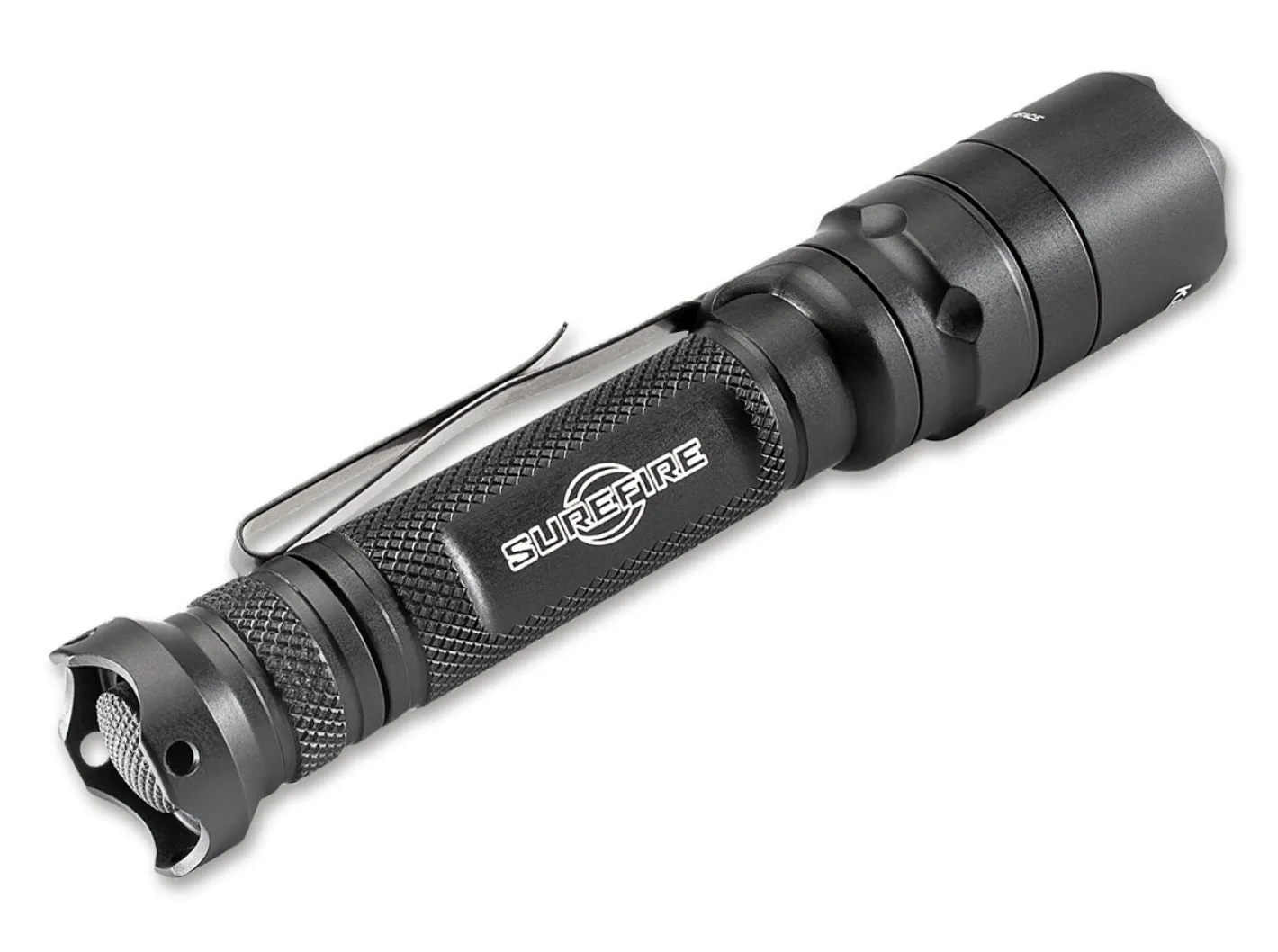 Die SureFire E2D Defender Tactical ist eine taktische Taschenlampe mit 1000 Lumen Maximalleistung und einer Reichweite von ca. 200 Metern. Die TIR-Linse erzeugt einen gleichmäßigen, optimierten Lichtstrahl, während gleichzeitig reichlich Umgebungslicht erhalten bleibt. Über den taktischen Schalter am Ende des hochfesten Aluminiumgehäuses werden die verschiedenen Funktionen aktiviert. Das robuste Gehäuse ist mit einer texturierten Oberflächenstruktur versehen und ist wasserdicht nach IPX7. Die E2D Defender ist mit einer robusten Schlag-Lünette ausgestattet und eignet sich somit ideal zum Brechen von Glas oder auch zur Selbstverteidigung. Die SureFire E2D Defender Tactical wird mit zwei CR123A Lithium Batterien ausgeliefert und kann ca. 165 Minuten betrieben werden. Mit Clip.