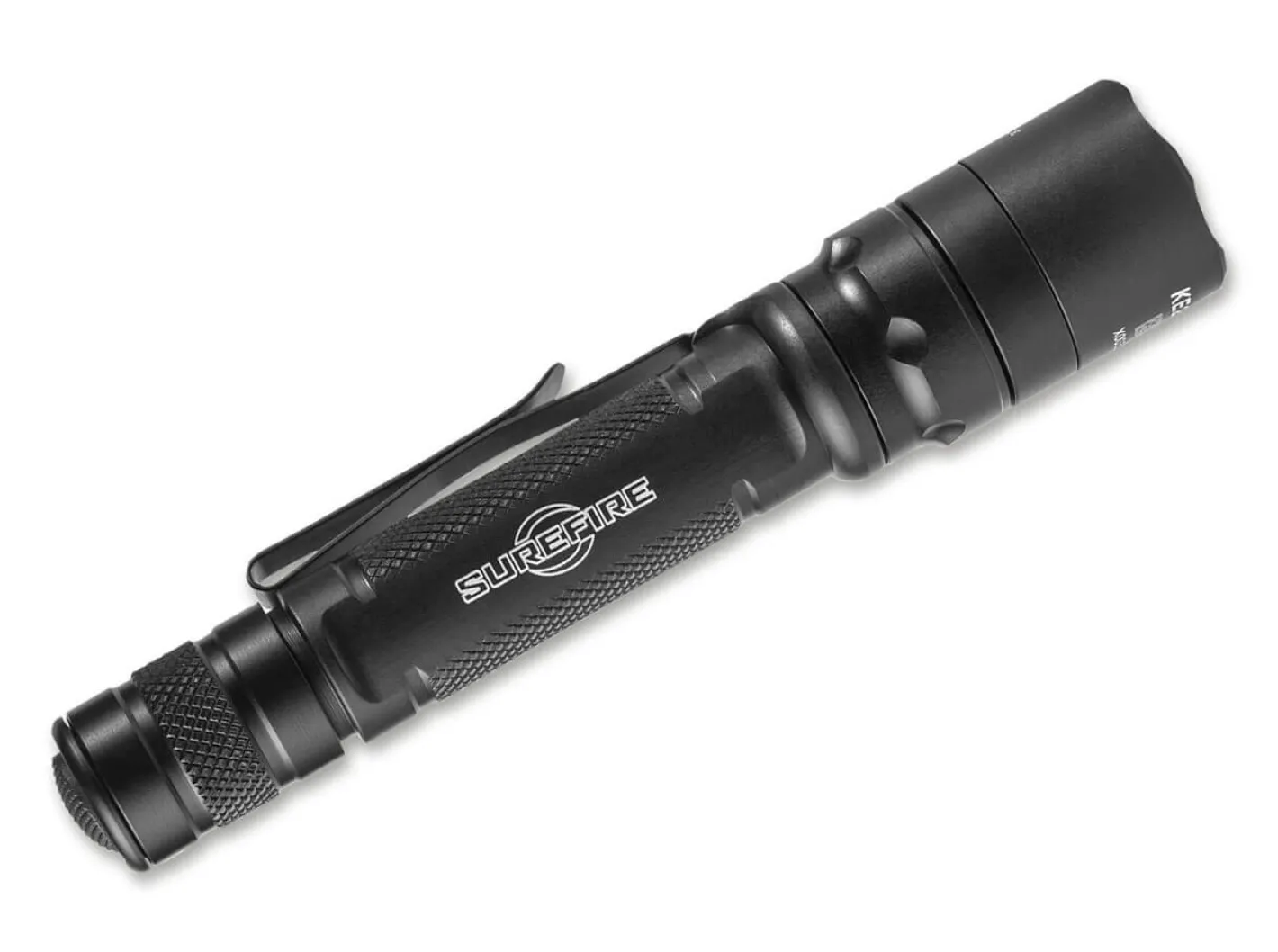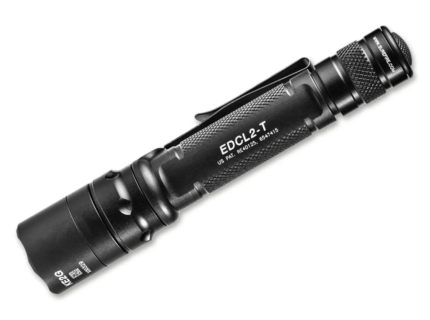Die EDCL2-T von SureFire ist die vergrößerte Version der beliebten EDCL1-T und wird statt mit nur einer Batterie mit zwei CR123A Batterie betrieben. Die robuste Taschenlampe überzeugt mit 1200 Lumen Maximalleistung und einer Reichweite von ca. 210 Metern. Zusätzlich kann die Lampe auch für bis zu 60 Stunden mit 5 Lumen betrieben werden. Die TIR-Linse erzeugt einen gleichmäßigen, optimierten Lichtstrahl, während gleichzeitig reichlich Umgebungslicht erhalten bleibt. Über den taktischen Schalter am Ende des hochfesten Aluminiumgehäuses werden die verschiedenen Funktionen aktiviert. Das robuste Gehäuse ist mit einer texturierten Oberflächenstruktur versehen und ist wasserdicht nach IPX7. Ein Zwei-Wege-Clip ermöglicht das Tragen der Lampe mit der Lünette nach oben oder nach unten. Die SureFire EDCL2-T wird mit zwei CR123A Lithium Batterien ausgeliefert und kann bei Maximalleistung ca. 60 Minuten betrieben werden.