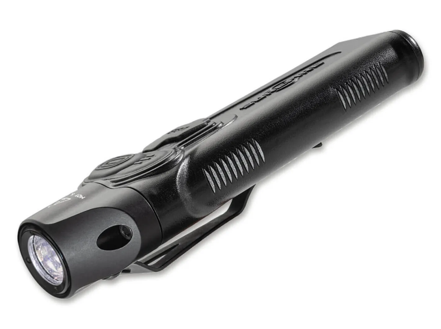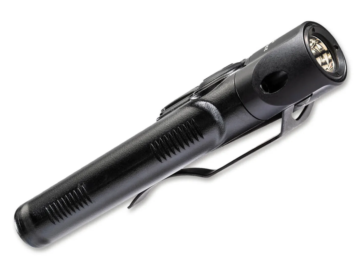 Die handliche SureFire Stiletto ist eine schlanke taktische Taschenlampe mit drei verschiedenen Leuchtstufen (650/250/5 Lumen) und einer maximalen Reichweite von ca. 78 Metern. Der von SureFire entwickelte MaxVision Beam Reflektor erzeugt einen gleichmäßigen, optimierten Lichtstrahl für den Nah- und Mittelbereich. Über die Schalter auf der Oberseite des nach IPX7 wasserdichten Gehäuses werden die verschiedenen Funktionen aktiviert. Der praktische Micro-USB-Anschluss ermöglicht das einfache Aufladen des integrierten Akkus, sodass kein zusätzliches Ladegerät erforderlich ist. Zudem verschafft die in das Gehäuse integrierte Kapazitätsanzeige Klarheit über den Ladezustand. Die SureFire Stiletto kann bei Maximalleistung ca. 105 Minuten betrieben werden. Mit widerstandsfähigem Clip.