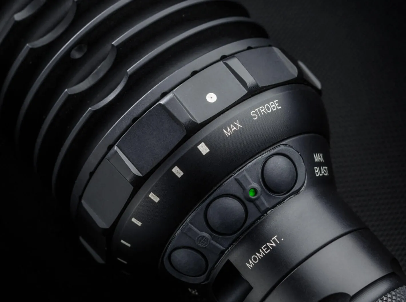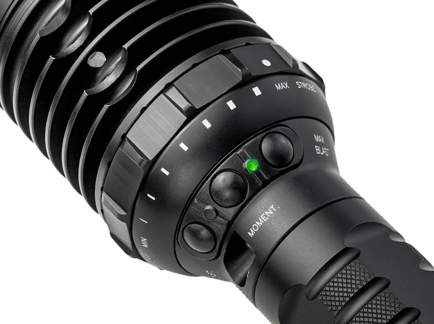 Die eindrucksvolle SureFire UDR Dominator ist mehr Flutlicht als klassische Taschenlampe und liefert mit 2400 Lumen genug Leuchtkraft, um augenblicklich ganze Bereiche zu erhellen. Die Reichweite beträgt dabei ca. 903 Meter. Neun wählbare Ausgabeeinstellungen, von maximaler Leistung bis hinunter zu 14 Lumen, decken von Scheinwerferanwendungen bis hin zu aufgabenorientiertem Arbeiten im Nahbereich alles ab. Der nahezu unverwüstliche LED-Präzisionsreflektor erzeugt einen gleichmäßigen, optimierten Lichtstrahl.Über den praktischen Drehring und die taktischen Schalter werden die verschiedenen Funktionen aktiviert. Das robuste Gehäuse aus widerstandsfähigem Aluminium ist mit einer feinen Texturierung versehen und zudem wasserdicht nach IPX7. Mit O-Ring und Dichtung für wetterfesten Schutz. Die SureFire UDR Dominator wird mit einem wiederaufladbarem Spezialakku ausgeliefert und kann damit ca. 135 Minuten lang betrieben werden. Alternativ lässt sich die Lampe dank Batteriefach auch durch die ebenfalls im Lieferumfang enthaltenen 12 CR123A Lithium Batterien mit Strom versorgen. Zudem verschafft die in das Gehäuse integrierte Kapazitätsanzeige Klarheit über den Ladezustand. Mit passendem Ladekabel und praktischem Tragegurt.