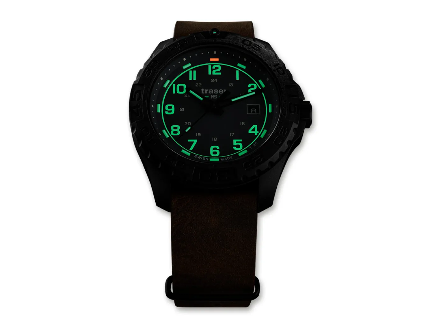 Die Traser P96 OdP Evolution ist der ideale Zeitmesser für Entdecker und Outdoor-Enthusiasten, der bei keinem Abenteuer fehlen darf. Extrem leicht, zäh und robust – diese Eigenschaften charakterisieren die sportliche P96 Outdoor Pioneer am besten. Zusätzliche Robustheit verleiht der P96 ein widerstandsfähiges glasfaserverstärktes Polymer-Gehäuse. Die Ablesbarkeit bei Nacht ist durch die hauseigene Selbstleuchttechnologie trigalight jederzeit gewährleistet.Die Uhr hat einen Durchmesser von 44 Millimetern und ist mit anti-reflektierendem, kratzfestem Saphirglas und einem Original Swiss Made Quarz Uhrwerk ausgestattet. Die grünen Ziffern und Uhrzeiger sitzen auf einem grauen Ziffernblatt. Das hochwertige Leder-Armband ist angenehm zu tragen. Die Uhr verfügt über eine Stoppfunktion und ist wasserdicht bis 20 bar oder 200 Meter. Die trigalight Selbstleuchttechnologie erleuchtet Index 1 bis 11 in grüner Farbe und Index 12 in orangener Farbe. Zusätzlich ist die einseitig drehbare Lünette mit Super-LumiNova beschichtet.