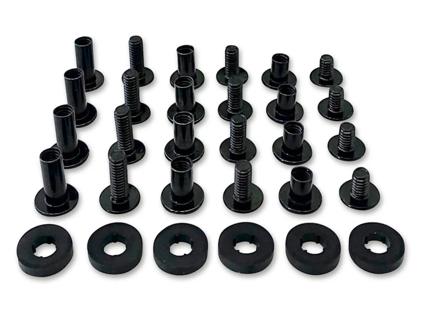Set mit 30 Teilen, bestehend aus Schrauben der Größen 1/4″, 3/8″ und 1/2″ (je 4 Stück), den dazugehörigen Hülsen und 6 Gummischeiben. Zur Montage von Ulticlips, Tek-Loks und vielen anderen Gürteladaptern an Kydexscheiden und Waffenholstern.