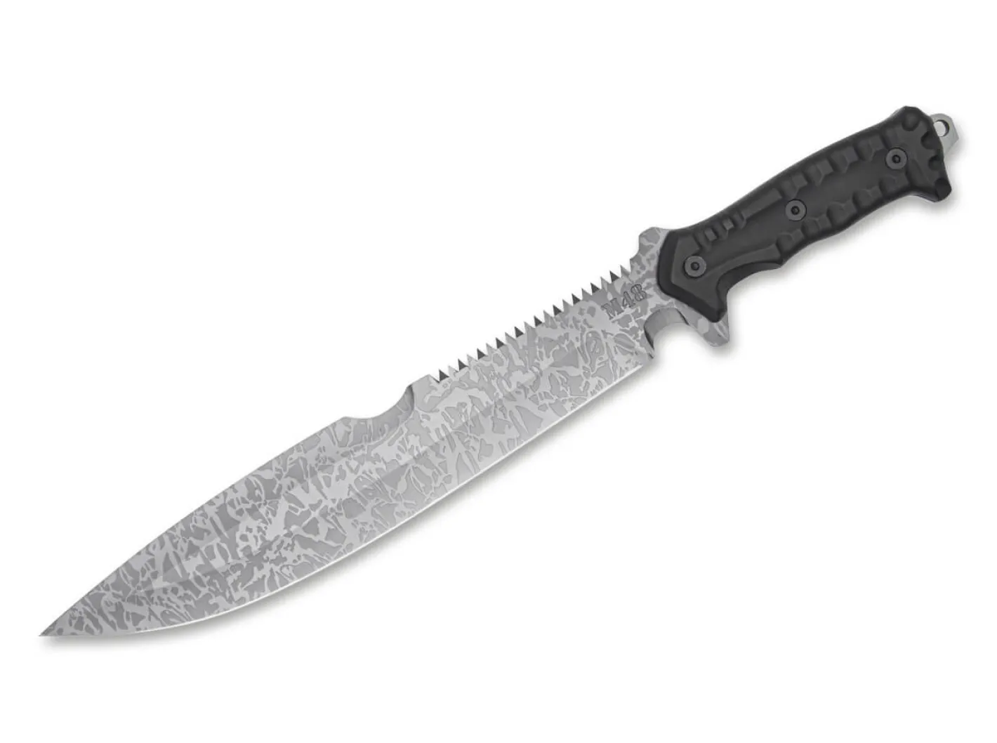 Die M48 Combat Machete der zweiten Generation ist sprichwörtlich bis an die Zähne bewaffnet und lehrt widerspenstigem Buschwerk das Fürchten. Auffällig hierbei ist insbesondere die kompromisslose Klinge aus rostfreiem 3Cr13, die über markante Sägezähne auf dem Klingenrücken verfügt und mit einer facettenreichen Titanbeschichtung verziert ist. Die stabile Vollerlbauweise und der rutschfeste TPU Griff untermalen den progressiven Charakter der Machete. Mit Fangriemenöse und passgenauer MOLLE Scheide.