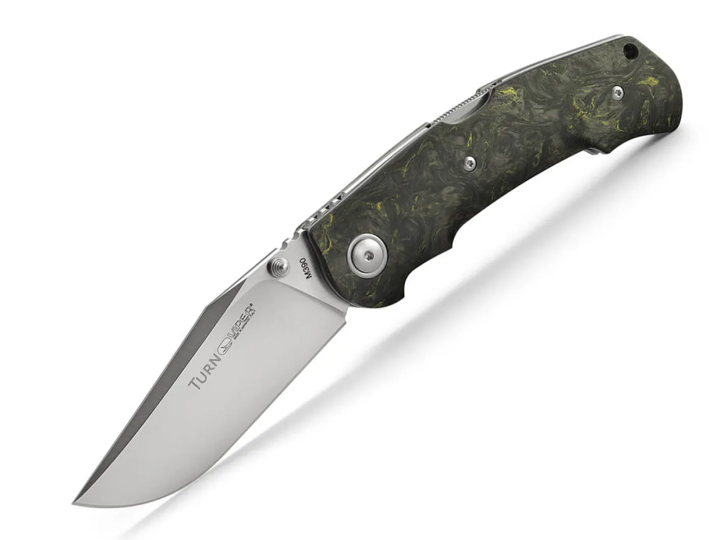 Immer auf dem richtigen Weg ist das elegante Viper Turn CF Yellow. Die äußerst robuste Klinge aus M390 wird per Daumenpin geöffnet und macht mit Hilfe des stabilen Backlocks aus Edelstahl nach getaner Arbeit kehrt. Der gelb durchsetzte Griff aus Kohlefaser ist ergonomisch geformt und liegt sicher in der Hand. Mit Fangriemenöse und edlem Titanclip (Tip-up/r).