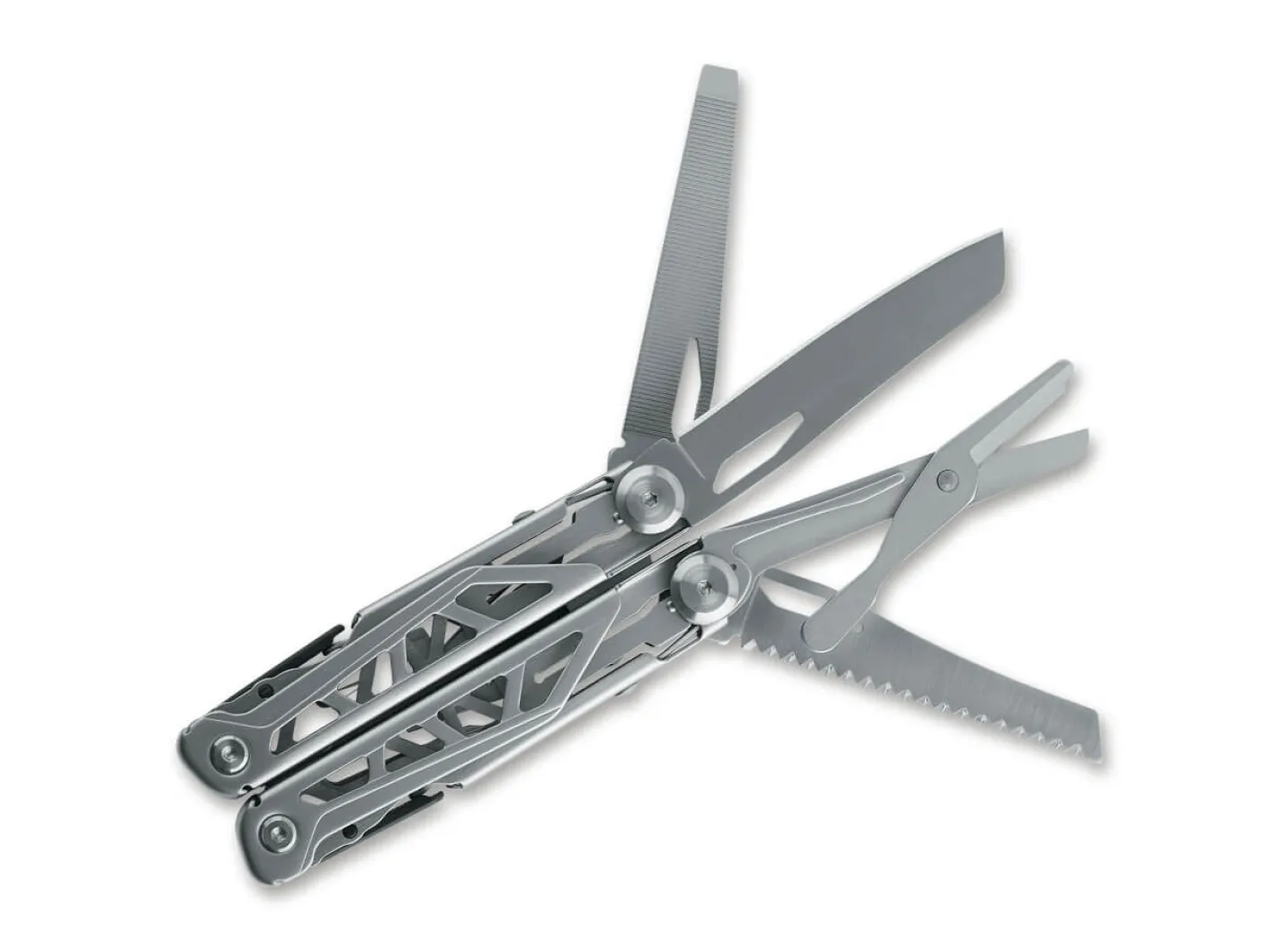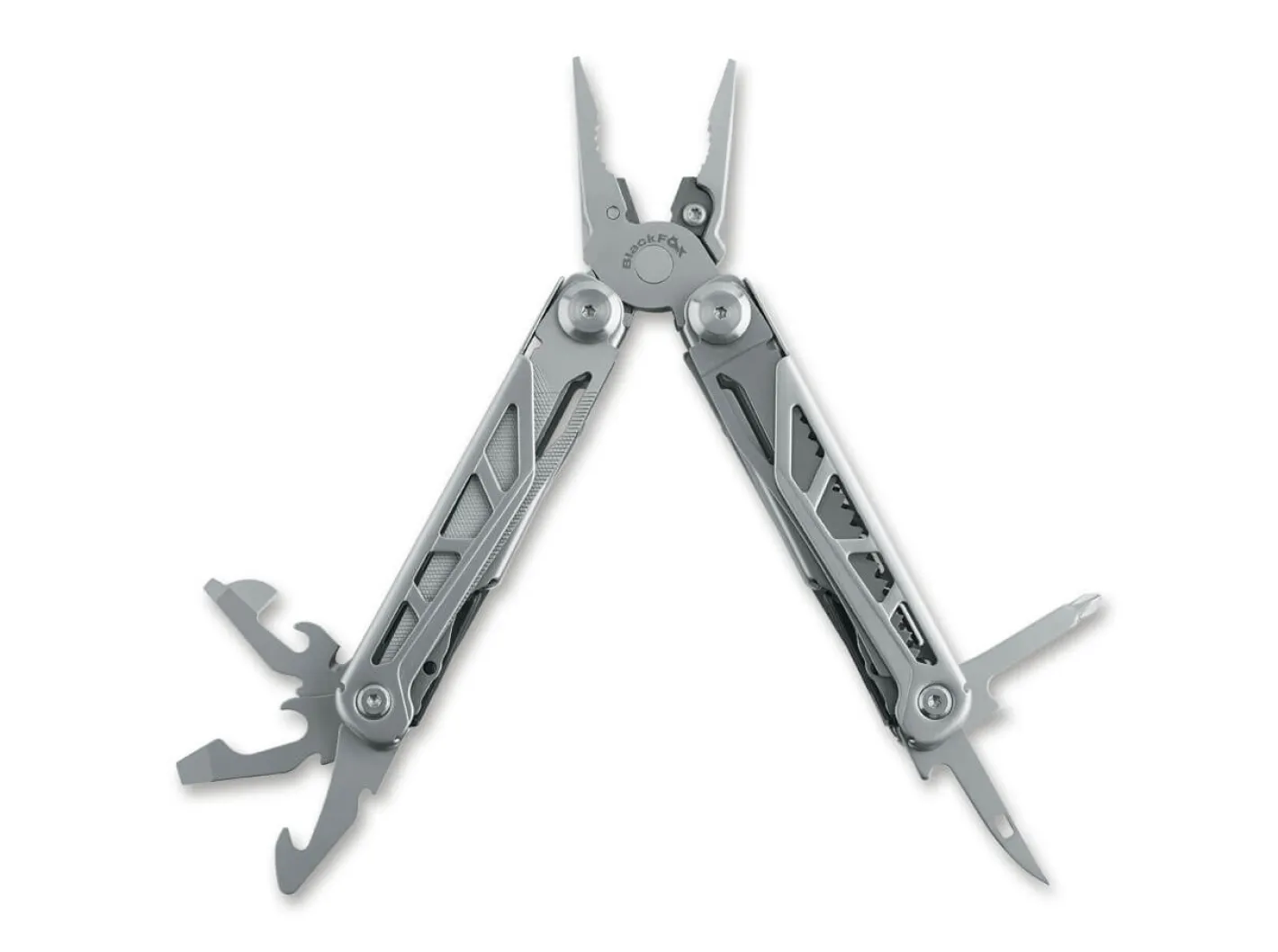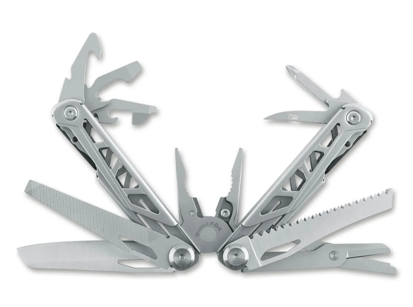 BlackFox präsentiert mit dem Endurance ein imposantes Multitool in einer Skelettkonstruktion aus Edelstahl. Das Werkzeug ist u.a. ausgestattet mit einer Kombizange, Messerklinge, Flaschenöffner, Dosenöffner, Feile, Säge, Schere und einem Philips Schraubendreher. Lieferung mit passgenauem Etui.