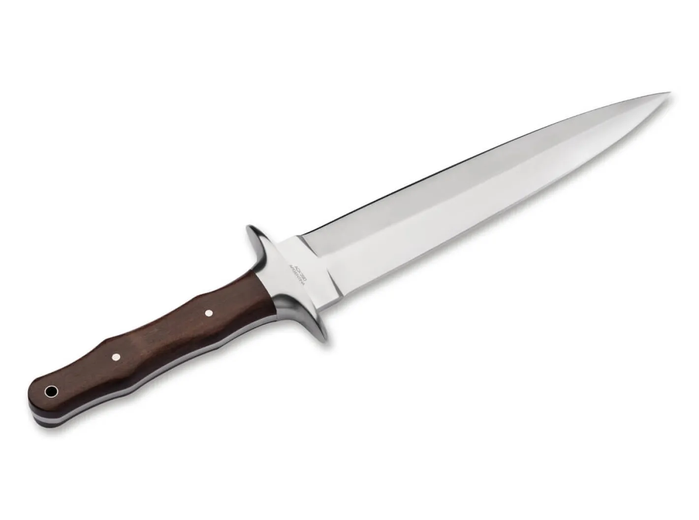 Das Böker Arbolito Colmillo ist als klassischer Hirschfänger mit einer langen Dolchklinge ausgestattet und beeindruckt mit seiner stabilen Vollerl-Bauweise sowie seiner beachtlichen Größe selbst erfahrene Jäger. Die beidseitig abgezogene Klinge aus ACX 390 ist mit einem feinen Satin-Finish versehen, der ausladende Handschutz besteht aus Neusilber. Für die ergonomisch geformten Griffschalen kommt edles Guayacan-Ebenholz zum Einsatz, das mit den Neusilbernieten im Griff die traditionelle Anmutung des feststehenden Jagdmessers zusätzlich unterstreicht. Mit Fangriemenöse und hochwertiger Gürtelscheide aus braunem Leder.