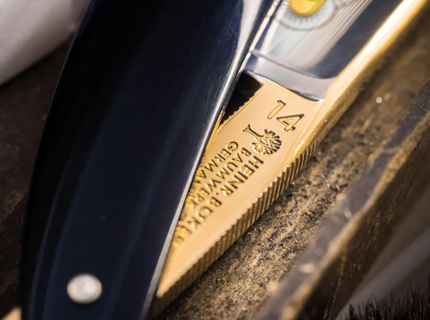 Während geschmiedete Rasiermesser und die klassische Nassrasur eine Renaissance erleben, besitzen echte Breitschwerter weiterhin Seltenheitswert. Seit jahrzehntelanger, vielleicht sogar jahrhundertelanger Abstinenz finden sich erstmalig wieder 8/8 Zoll breite Rasiermesser in unserem Sortiment. In Zeiten, in denen die mächtigen Klingen noch häufiger anzutreffen waren, wurden 8/8 Zoll breite Rasiermesser mit Gradkopf als 14er bezeichnet. Diese Kennzeichnung wurde vor dem Härten der geschmiedeten Klingen mit einem Stempel in den Erl der Klinge eingeschlagen. Diese Besonderheit haben wir uns nicht nehmen lassen und auch bei unserem Böker 14er umgesetzt.Die 8/8 Zoll breite Klinge trägt nicht nur eine historische Klingenätzung mit partieller Vergoldung, sondern auch einen vergoldeten Klingenrücken und Erl, der durch eine filigrane und detailreiche Lasergravur elegant verziert wird. Die vollständige Politur der Klinge und die beidseitige Serrierung am Erl runden die Ausstattung dieses Messers ab. Auch bei dem verwendeten Heftmaterial haben wir uns an historischen Vorbildern orientiert. Die Beschalung aus dunklem, leicht transparenten Acryl fügt sich durch die dezente Messing-Intarsie stimmig in das Gesamtbild ein. Die Klinge wird extrahohl mit Wall geschliffen. Mit authentischem Böker Stempel im Klingengang, Echtheitszertifikat und edlem Schwebedisplay. Handgefertigt in der Böker Messer-Manufaktur Solingen.