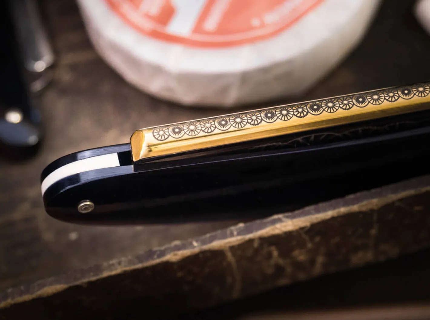 Während geschmiedete Rasiermesser und die klassische Nassrasur eine Renaissance erleben, besitzen echte Breitschwerter weiterhin Seltenheitswert. Seit jahrzehntelanger, vielleicht sogar jahrhundertelanger Abstinenz finden sich erstmalig wieder 8/8 Zoll breite Rasiermesser in unserem Sortiment. In Zeiten, in denen die mächtigen Klingen noch häufiger anzutreffen waren, wurden 8/8 Zoll breite Rasiermesser mit Gradkopf als 14er bezeichnet. Diese Kennzeichnung wurde vor dem Härten der geschmiedeten Klingen mit einem Stempel in den Erl der Klinge eingeschlagen. Diese Besonderheit haben wir uns nicht nehmen lassen und auch bei unserem Böker 14er umgesetzt.Die 8/8 Zoll breite Klinge trägt nicht nur eine historische Klingenätzung mit partieller Vergoldung, sondern auch einen vergoldeten Klingenrücken und Erl, der durch eine filigrane und detailreiche Lasergravur elegant verziert wird. Die vollständige Politur der Klinge und die beidseitige Serrierung am Erl runden die Ausstattung dieses Messers ab. Auch bei dem verwendeten Heftmaterial haben wir uns an historischen Vorbildern orientiert. Die Beschalung aus dunklem, leicht transparenten Acryl fügt sich durch die dezente Messing-Intarsie stimmig in das Gesamtbild ein. Die Klinge wird extrahohl mit Wall geschliffen. Mit authentischem Böker Stempel im Klingengang, Echtheitszertifikat und edlem Schwebedisplay. Handgefertigt in der Böker Messer-Manufaktur Solingen.