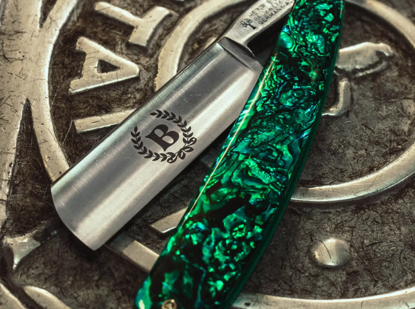Das Böker Abalone vereint eine außergewöhnliche Optik mit einer herausragenden Performance. Die im Gesenk geschmiedete Klinge dieses Ausnahmemessers wird aus dem Kohlenstoffstahl O1 (1.2510) gefertigt und auf 59-61 HRC gehärtet. Aufgrund seiner überlegenen Eigenschaften und seiner exzellenten Schnitthaltigkeit eignet sich dieser Kohlenstoffstahl hervorragend für hochwertige Rasiermesser. Neben klassischen Materialien, die seit vielen Jahrzehnten die beliebten Modelle des Böker Rasiermessersortiments prägen, sind wir kontinuierlich auf der Suche nach modernen und innovativen Naturmaterialkombinationen, die aufgrund ihrer besonderen Anmutung oder Haptik für Begeisterung sorgen. Weißes Gold, Seeschnecken, See- oder Meerohren sind nur einige Synonyme für Abalone.Die Weichtiere, die sich vor den Küsten in Australien, Neuseeland, Japan, China, Mexiko und in Südafrika einige Meter unter der Wasseroberfläche festsaugen, gelten als Delikatesse und haben aufgrund ihrer Begehrlichkeit in der Vergangenheit ganze Bandenkriege ausgelöst. Heute wird das kostbare Naturprodukt in Aquakulturfarmen gezüchtet. Die wunderschönen und fast schon künstlich schimmernden Schalen dieser beliebten Weichtiere werden seit jeher als Dekorationsobjekt, als Gebrauchsgegenstand oder als Ausgangsmaterial für Schmuck, Intarsien oder Perlmutt-Spangen verwendet. Durch die Verwendung modernster Fertigungsverfahren wird eine hauchdünne Schicht bunter Abalone auf ein Trägermaterial aufgebracht und mit transparentem Acryl umgossen. Das so gewonnene, sehr widerstandsfähige Material eignet sich hervorragend für die Fertigung der Rasiermesserhefte und begeistert durch ein außergewöhnliches Farbenspiel und eine dreidimensionale Optik.Die 6/8 Zoll breite Klinge dieses außergewöhnlichen Rasiermessers wird extra hohl auf Klang ausgeschliffen und mit einer beidseitigen Serrierung ausgestattet. Der französische Kopf der Rasiermesserklinge aus dem Kohlenstoffstahl O1 fügt sich harmonisch in das außergewöhnliche Heft aus Abalone ein. Die schlichte Lasergravur geht zurück auf eine historische Klingenätzung, die bereits Anfang des 20. Jahrhunderts für besonders ausgefallene Rasiermesser von Böker verwendet wurde. Auslieferung in einem hochwertigen Rahmenetui und mit Echtheitszertifikat.