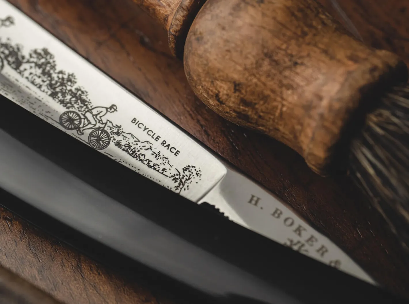 Noch bevor sich die Tour de France als bedeutendstes Radrennen der Welt etablieren konnte, quälten sich die einstigen Helden auf zwei Rädern über grobes Kopfsteinpflaster, staubige Schotterpisten und teils kurze und giftige Anstiege. Stahlrahmen, Baumwolltrikot, Casquette, nur ein Gang aber dafür ein heldenhafter Schnurrbart waren die übliche Ausstattung, mit der es auf die unbarmherzigen 250 km der klassischen Eintagesrennen ging. Aus diesem nostalgischen Zauber heraus entstanden die fünf Monumente des Radsports, die bis heute zahlreiche Radsportanhänger begeistern. Die ersten dieser traditionsreichen Eintagesklassiker fanden Ihren Ursprung in Belgien und Frankreich bereits vor 1900 und brachten den Siegern Ruhm und Ehre ein.Böker holt ein Stück Geschichte zurück und präsentiert das Böker Bicycle Race als Neuauflage des um 1900 erschienenen gleichnamigen Rasiermessers. Die Klinge des weltweit auf 300 Exemplare limitierten Sondermodells zeigt nach historischem Vorbild ein klassisches Radrennen in malerischer Landschaft. Dabei füllt das aufwendig restaurierte und in mehreren Schichten gelaserte Motiv fast die komplette Klinge aus, während das historische H. Boker & Co Logo den Klingengang ziert.Die 5/8 Zoll breite Klinge aus widerstandsfähigem Kohlenstoffstahl ist mit einem Gradkopf versehen und steht für die Vielseitigkeit, Robustheit und Geradlinigkeit jener klassischen Fahrräder, die mit einer festgelegten Ausstattung für alle Terrains gewappnet sein mussten – das Böker Bicycle Race steht dem in puncto Rasur also in nichts nach. Das edle Satin Finish und die einseitige Serrierung runden das heldenhafte Profil des Rasiermessers ab. Der ballige Griff aus schwarzem Kunststoff würde zeitgenössisch mit zwei Nieten aus Neusilber veredelt. Lieferung mit Echtheitszertifikat und historischer Verpackung. Handgefertigt in der Böker Messer-Manufaktur Solingen.
