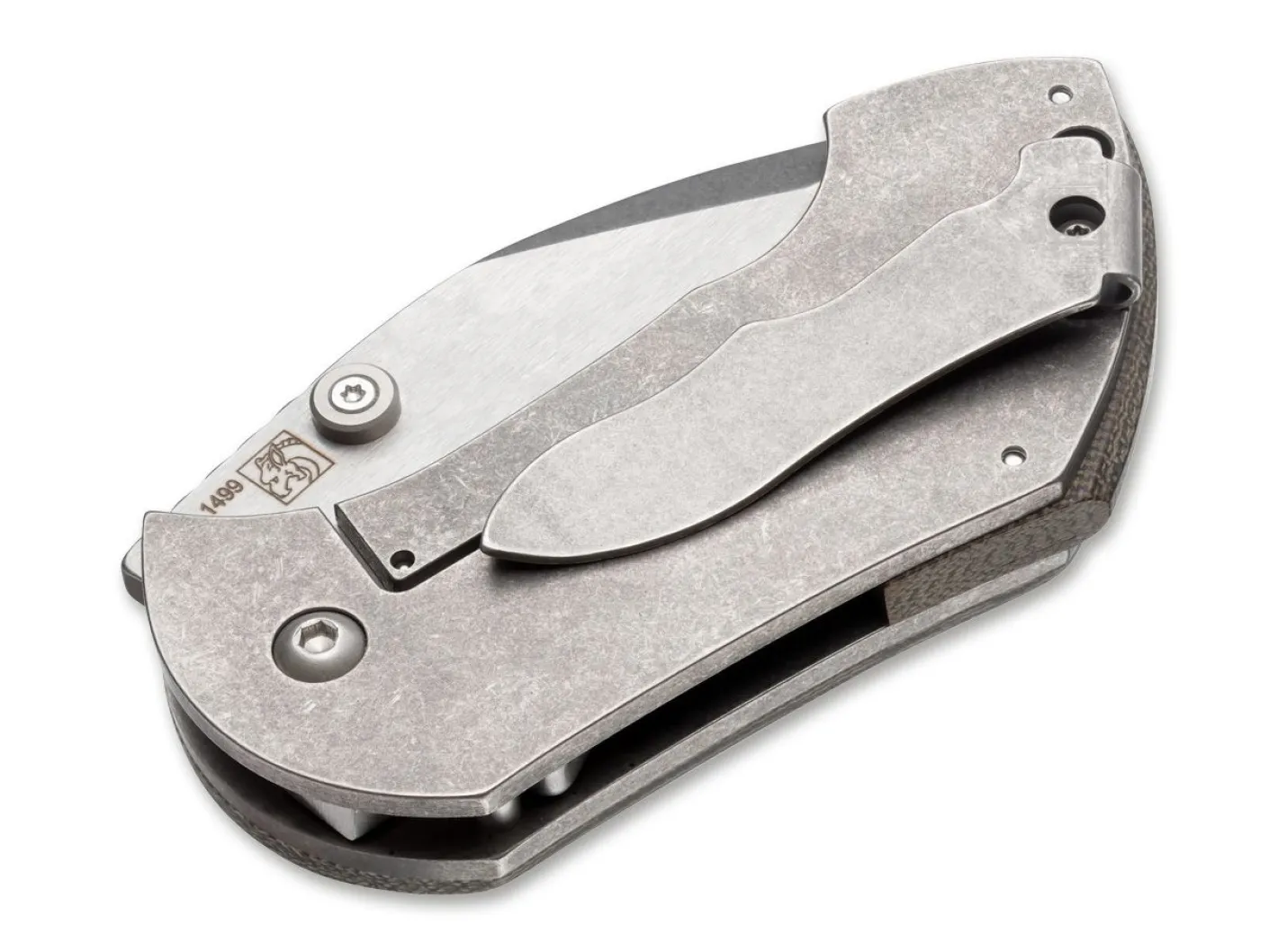Das Böker Pimpsqueak von Neil Blackwood widersetzt sich erfolgreich jeglicher Einordnung in eine Kategorie. Je nach Standpunkt ist es das „kleinste große Messer“ oder das „größte kleine Messer“, das wir kennen. Klingen- und Griffbreite sowie die Materialstärken sind die eines ausgewachsenen Tactical Folders, während die Gesamtlänge und die Proportionen das Messer ganz klar dem handlichen, kompakten Teil der Messerwelt zuordnen.Die soliden Titanplatinen tragen auf der Vorderseite eine Griffschale aus Green Canvas Micarta, während die unbeschalte Rückseite den außerordentlich stabilen Framelock bildet. Das Zwischenstück im Griff besteht ebenfalls aus Micarta und steht rückenflossenartig an Griffende hervor. Das markante Two-Tone Finish betont den schönen Schwung der Klinge. Als Stahl kommt auch hier der pulver-metallurgische Hochleistungsstahl CPM-S-35VN zum Einsatz, der sich vor allem durch den Legierungsbestandteil Niob auszeichnet. Als besonderen Akzent zeichnet der Clip die Gesamtkontur des offenen Messers nach. Ein Traum von einem Messer, nach dem Design eines wahrhaft legendären Messermachers, das sowohl dem Sammler wie auch dem Nutzer anhaltende Freude bereitet.