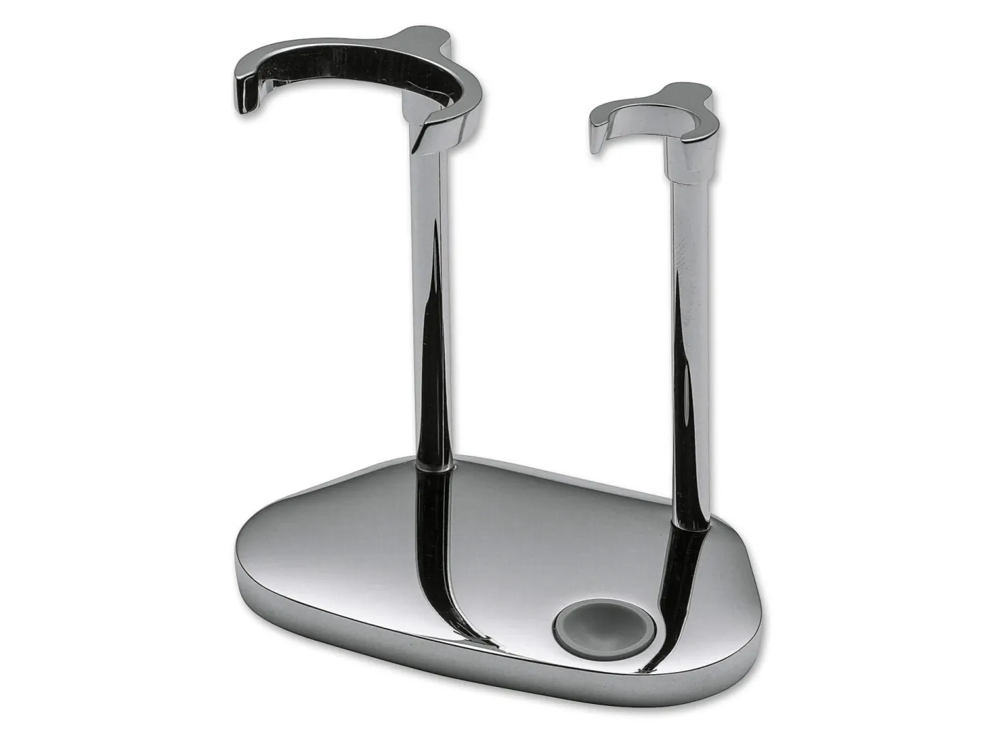 Praktischer Chromständer (9,3 cm Höhe) für ein klassisches Rasiermesser samt Pinsel. Der Durchmesser des Pinselhalters beträgt 3,4 cm.