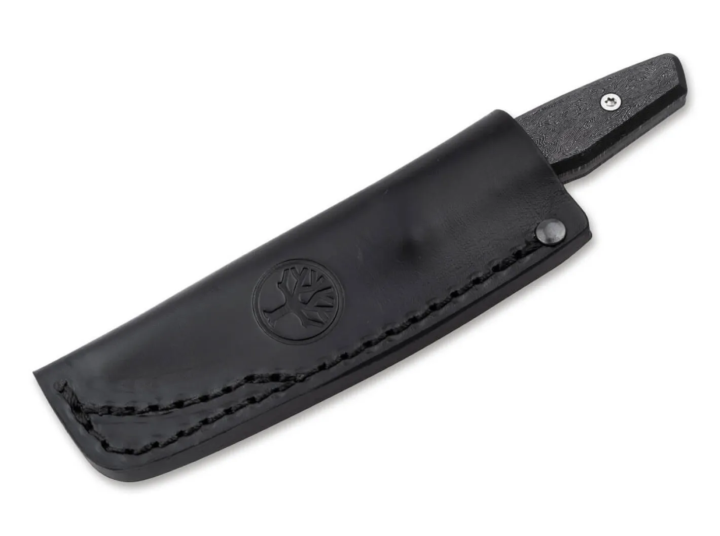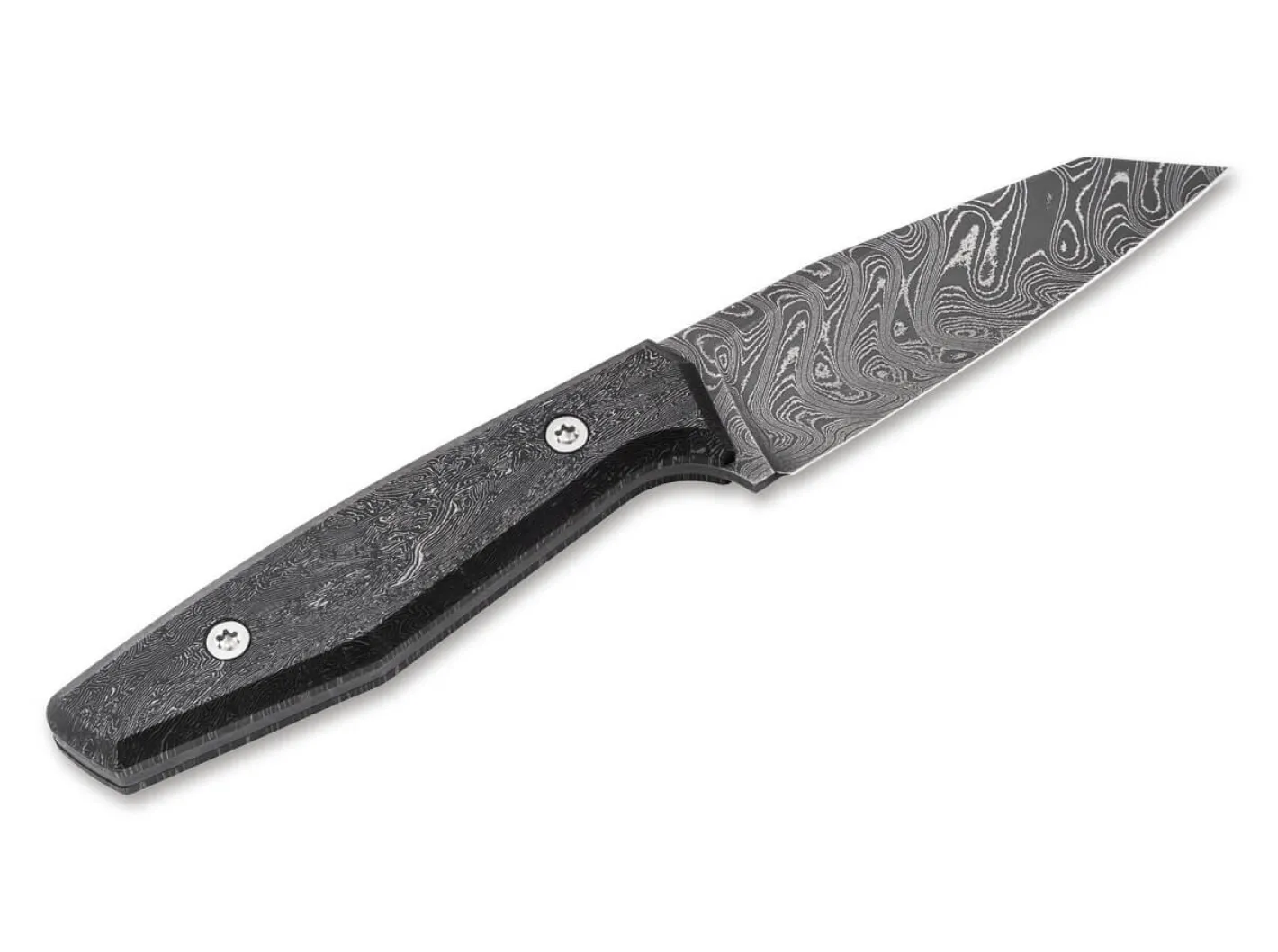 Das in Kooperation mit dem jungen Messermacher Alex Kremer und Daily Customs entstandene Böker Daily Knives AK1 ist ein vielseitiges kleines Alltagsmesser, welches nicht nur als EDC restlos überzeugt und bereits Kultstatus genießt.Der große Erfolg der Modelle mit Klingenstahl RWL-34 hat uns dazu veranlasst eine high-end Version zu konzipieren. Hatte uns der Hersteller Fat Carbon schon zuvor immer wieder mit Verbundmustern überrascht, die wir uns bis dahin nicht hatten vorstellen können, so setzt das neue Material Fat Carbon Space-Coral Silver einen vollkommen neuen Akzent. Der Querschnitt des Musters ist um 90° gedreht und der gleichmäßige Abstand der feinen Linien sind in genial geordnetem Chaos arrangiert.Dieses Werkstoff-Highlight war uns gerade gut genug um es als Griffschalen für die Klinge und den Erl aus rostfreiem Damast von Chad Nichols im Muster Boomerang zu verwenden. So entsteht ein reizvolles optisches Zusammenspiel der Materialen, die zudem beide in ihren jeweiligen Funktionen die besten mechanischen Eigenschaften aufweisen.Die Griffschalen lassen sich mühelos mit dem beiliegenden Torx-Schlüssel demontieren, sodass die aufwendig gefertigte Fangriemenöse am Griffende bei demontierten Griffschalen herumgedreht werden kann und wahlweise im Griff verschwindet.Lieferung mit hochwertiger schwarzer Lederscheide, die mit einem eingenähten Ulticlip versehen ist und dank der arretierenden Federklammer bequem am Taschensaum befestigt werden kann. So lässt sich das Böker AK1 Damast mühelos ziehen, während die Scheide vom Ulticlip zuverlässig an Ort und Stelle gehalten wird. Handgefertigt in der Böker Messer-Manufaktur Solingen.