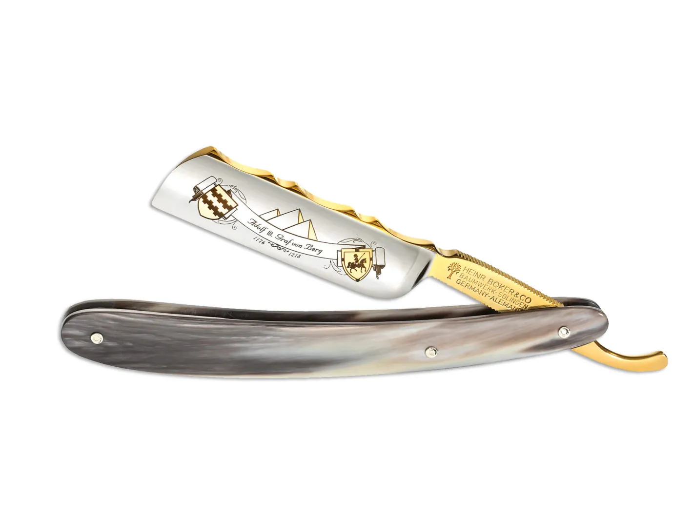 Unweit vom Firmensitz der Böker Manufaktur in Solingen befindet sich mit Schloss Burg an der Wupper das Wahrzeichen des Bergischen Landes. Sie ist zugleich eine der größten Burgen Westdeutschlands und die größte rekonstruierte Burganlage in Nordrhein-Westfalen. Die ruhmreiche Geschichte von Schloss Burg ist untrennbar mit dem Herzogtum Berg und den Grafen von Berg (Haus Berg 1068-1225) verbunden. Dies haben wir zum Anlass genommen, um den drei Grafen von Berg eine Rasiermesserserie zu widmen, welche Teile des Lebens der drei Grafen symbolisiert und mit beeindruckenden Verzierungen aus 24 Karat Gold an die beträchtlichen Besitztümer und den Machteinfluss der Grafen erinnert.Das außergewöhnliche Rasiermesser in 6/8 Zoll symbolisiert den Tod von Adolf III. Graf von Berg während des Fünften Kreuzzuges in Ägypten. Den Abschluss der hochglanzpolierten Klinge säumt ein französicher Kopf, der die besondere Eleganz dieses Messers unterstreicht. Handverlesene Hornhefte mit zusätzlicher Zierniete, der aufwendige Schliff des Klingenrückens und die partielle Vergoldung (24 Karat) sind nur als einige Highlights zu nennen. Die Klinge wird extrahohl mit Wall geschliffen. Auslieferung erfolgt in einem edlen Präsentationsdisplay mit Echtheitszertifikat und individueller Seriennummer.