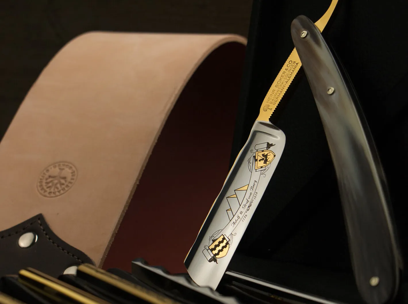 Unweit vom Firmensitz der Böker Manufaktur in Solingen befindet sich mit Schloss Burg an der Wupper das Wahrzeichen des Bergischen Landes. Sie ist zugleich eine der größten Burgen Westdeutschlands und die größte rekonstruierte Burganlage in Nordrhein-Westfalen. Die ruhmreiche Geschichte von Schloss Burg ist untrennbar mit dem Herzogtum Berg und den Grafen von Berg (Haus Berg 1068-1225) verbunden. Dies haben wir zum Anlass genommen, um den drei Grafen von Berg eine Rasiermesserserie zu widmen, welche Teile des Lebens der drei Grafen symbolisiert und mit beeindruckenden Verzierungen aus 24 Karat Gold an die beträchtlichen Besitztümer und den Machteinfluss der Grafen erinnert.Das außergewöhnliche Rasiermesser in 6/8 Zoll symbolisiert den Tod von Adolf III. Graf von Berg während des Fünften Kreuzzuges in Ägypten. Den Abschluss der hochglanzpolierten Klinge säumt ein französicher Kopf, der die besondere Eleganz dieses Messers unterstreicht. Handverlesene Hornhefte mit zusätzlicher Zierniete, der aufwendige Schliff des Klingenrückens und die partielle Vergoldung (24 Karat) sind nur als einige Highlights zu nennen. Die Klinge wird extrahohl mit Wall geschliffen. Auslieferung erfolgt in einem edlen Präsentationsdisplay mit Echtheitszertifikat und individueller Seriennummer.