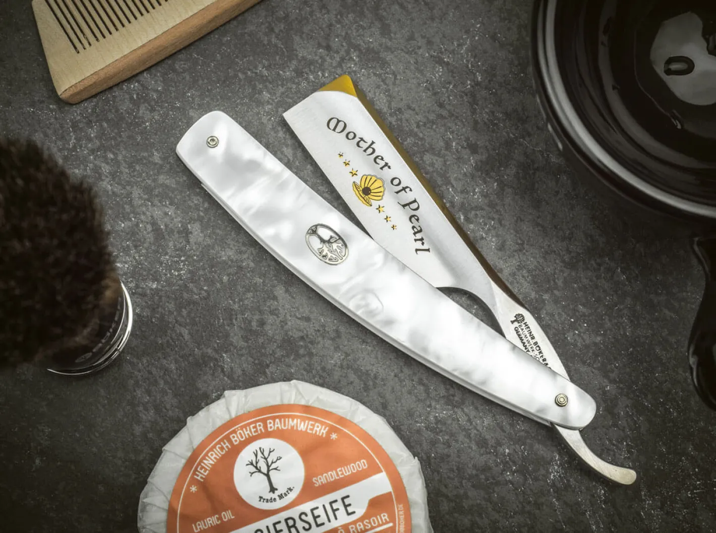 Die geschliffenen und polierten Schalen der Perlmuscheln waren einst ein gängiges Währungsmaterial und kommen seit langer Zeit bei der Herstellung von Schmuck zum Einsatz. Die Hefte des Böker Mother of Pearl bestehen aus Perlmutt-Imitat und sind im Gegensatz zum Naturmaterial sehr robust. Der schimmernde Griff harmoniert wunderschön mit der partiellen Vergoldung des Klingenrückens und des Schors. Die extrahohl und mit Wall geschliffene Klinge in der Größe 6/8 Zoll wird aus dem klassischen, nicht rostfreien Kohlenstoffstahl O1 gefertigt. Mit authentischem Böker Stempel im Klingengang, Echtheitszertifikat und historischer Verpackung. Handgefertigt in der Böker Messer-Manufaktur Solingen.