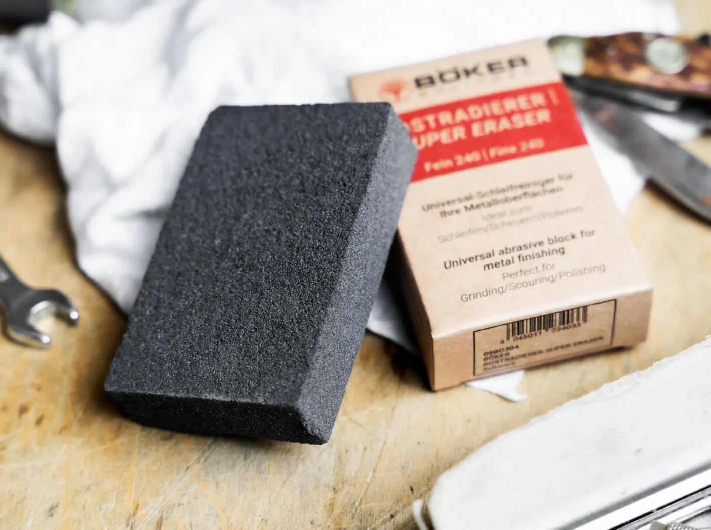 Der vielseitige Böker Rostradierer entfernt mühelos Rostflecken sowie Verfärbungen auf Metalloberflächen. Besonders bei Klingen aus Kohlenstoffstahl können nach einiger Zeit die typischen dunklen Flecken sowie Rost auftreten. Dies ist absolut normal und stellt keinen Mangel dar, stört aber unter Umständen das optische Erscheinungsbild des Messers. Um den Klingen wieder neuen Glanz zu verleihen, empfiehlt sich daher die regelmäßige Pflege mit dem Böker Rostradierer. Dank der 240er Körnung eignet sich der Universal-Schleifreiniger perfekt zum Schleifen, Scheuern, Glätten, Reinigen und Polieren von Metallflächen. Hergestellt in Deutschland.