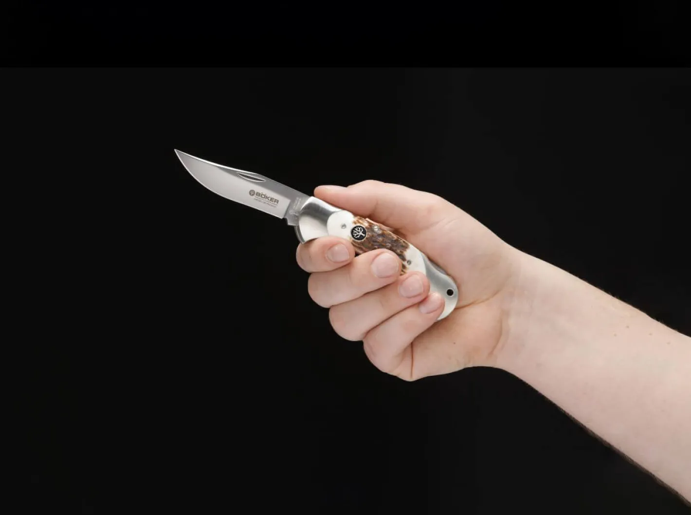 Das Böker Scout ist seit 1985 fest mit unserem Namen verbunden. Ob damals jemand damit gerechnet hätte, dass das Taschenmesser zu einem der erfolgreichsten und beliebtesten Messer aus unserem Programm wird, vermag heute niemand mehr zu sagen. Aber diese vielen Jahre sind in Zeiten kurzlebiger Modeerscheinungen, die auch auf dem Messermarkt nicht ungewöhnlich sind, auf jeden Fall eine Besonderheit. Die Varianten des Scouts waren in dieser Zeit wohl so zahlreich wie von kaum einem anderen Modell, allerdings wurde an den Eckdaten nie etwas geändert.Der äußerst stabile Körper aus einem Stück Neusilber wird im Sinterverfahren hergestellt und anschließend poliert. Beim Sintern werden die Ausgangsstoffe vermischt, durch Erwärmung miteinander verbunden und in die gewünschte Form gebracht. Die hohlgeschliffene Klinge aus rostfreiem N690 wird von Böhler geschmiedet und trägt mit ihrer einprägsamem Form zum unvergleichlichen Erscheinungsbild des Scouts bei.Ein klassischer Backlock übernimmt die Verriegelung und hält die Klinge sicher offen. Die im Innern des Griffes verborgene Mechanik besteht aus einer Bolzenwippe und einer Feder. Bei ausgeklappter Klinge greift die Bolzenwippe in eine Aussparung der Klinge und arretiert sie dadurch. Das hintere Ende der Bolzenwippe wird nicht vollständig vom Griff verdeckt, sondern liegt am Griffrücken zum Teil frei, damit sie betätigt werden kann. Wird nun das freiliegende hintere Ende der Bolzenwippe gedrückt, hebt sich der Haken aus der Kerbe, sodass sich die Arretierung löst und die Klinge eingeklappt werden kann. Die angenehm geformten Griffschalen aus echtem Hirschhorn runden das harmonische Bild des Klassikers ab.