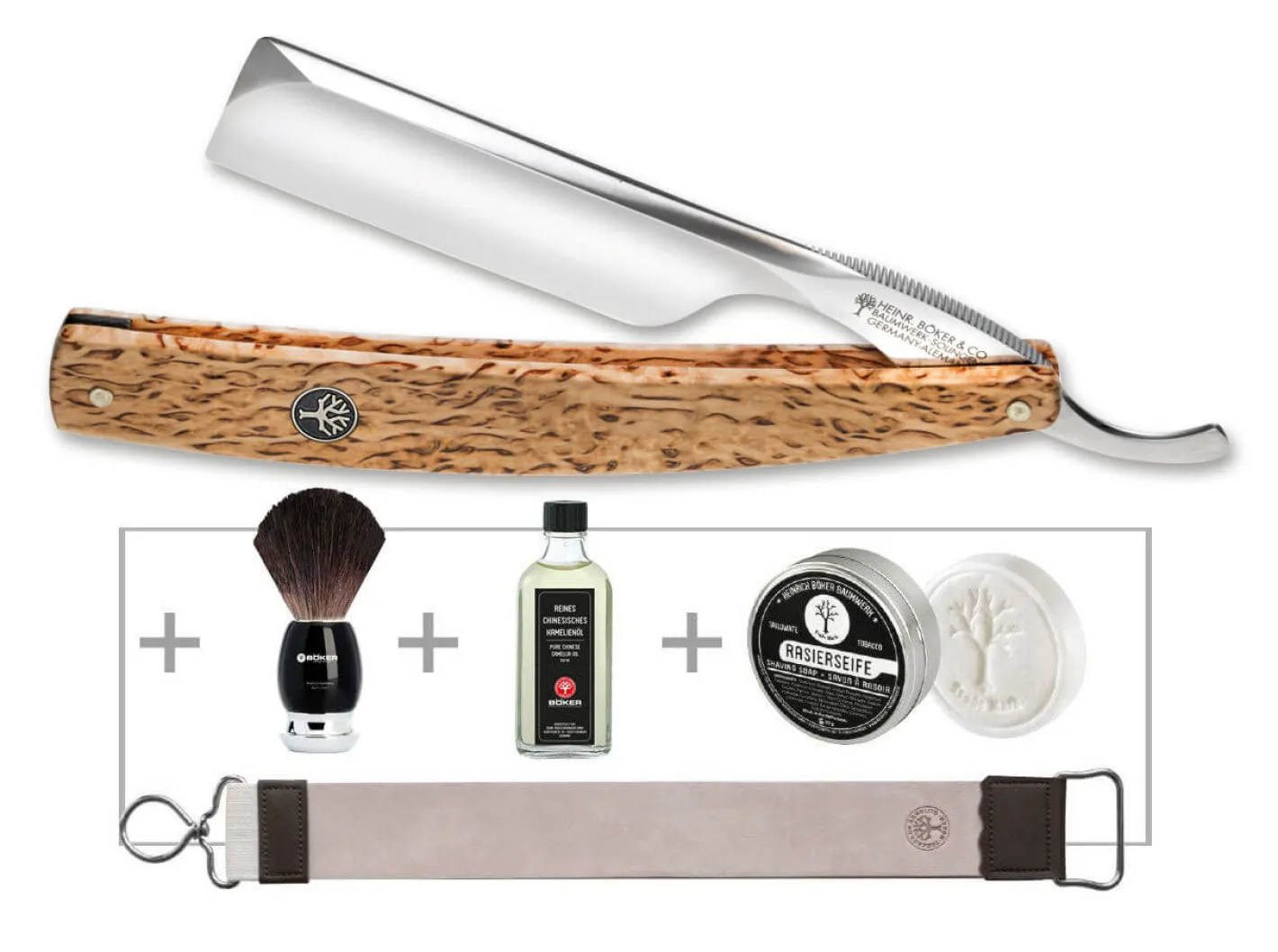 Bereits im Produktkatalog von Boker USA aus dem Jahr 1906 trugen besonders hochwertige Modelle den traditionsreichen Namen The Celebrated. Das Holz der im hohen Norden Europas beheimateten Maserbirke wird aufgrund seiner besonderen Charakteristik gern bei außergewöhnlichen Messern verwendet. Die moderne Heftform inklusive Baumschild, die 6/8 Zoll Klinge aus Kohlenstoffstahl mit Spitzrücken und poliertem Schorrkopf kennzeichnen dieses aussergewöhnliche Modell. Die Klinge wird extrahohl mit Wall geschliffen. Mit Echtheitszertifikat und historischer Verpackung. Handgefertigt in der Böker Messer-Manufaktur Solingen.Eine der häufigsten Fragen unserer Kunden beim Einstieg in die klassische Nassrasur betrifft das notwendige Zubehör. Unser aktualisiertes Rasier-Zubehörset erleichtert die Auswahl und bietet optimale Bedingungen für einen guten Start in dieses spannende Thema. Das Rasur-Set beinhaltet beinhaltet den Rasierpinsel Classic Black, das Kamelienöl, den Böker Hängeriemen und die Rasierseife Tallowate Tobacco.Aufgrund der Verwendung natürlicher Materialien weichen die verschiedenen Exemplare teilweise voneinander ab.