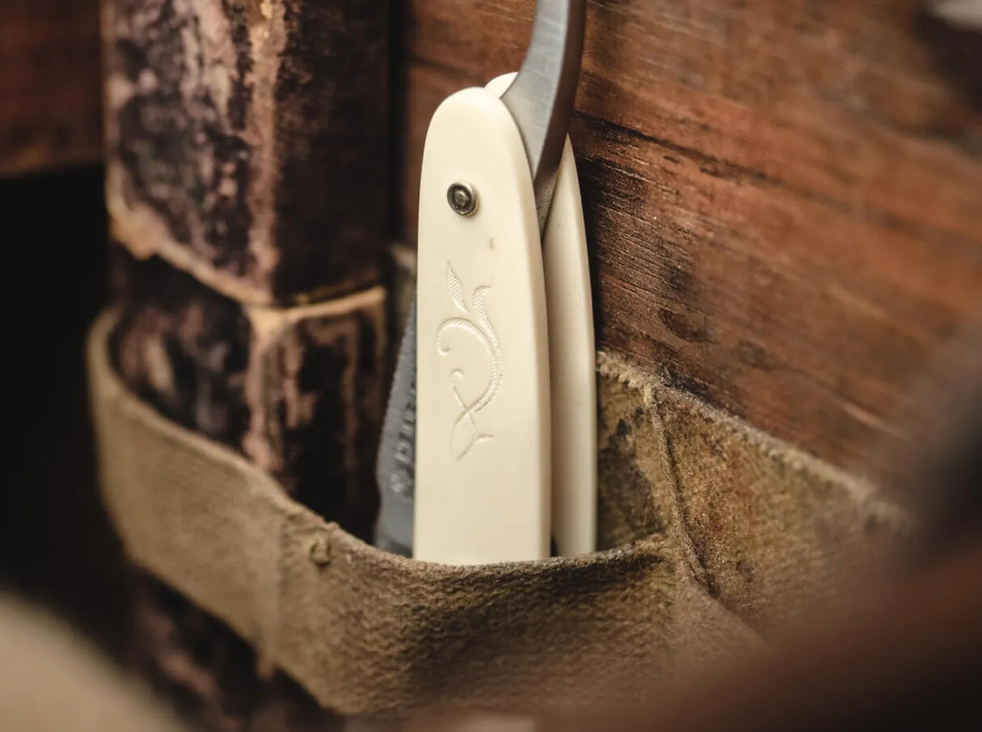 Wanted! – Ganz im Zeichen von Saloons, Cowboys und rauchenden Colts steht das Böker The Historical Barber. Benannt nach dem kultverdächtigen Barbier in der Westernstadt Pullmann City im Harz greift das auf 99 Exemplare streng limitierte Rasiermesser wesentliche Elemente historischer Böker Rasiermesser aus der amerikanischen Pionierzeit des Wilden Westens auf und überträgt diese in die heutige Zeit. Die satinierte 6/8 Zoll Klinge aus Kohlenstoffstahl ist extrahohl geschliffen und wird durch den namensgebenden Schriftzug formschön geziert.Die avantgardistische Interpretation des Barber’s Notch gibt dem Messer sprichwörtlich die Sporen und dekoriert das Böker The Historical Barber zum einzig wahren Westernhelden. Gleichsam elegant wie funktionell säumen geschliffene Kullen den Klingenrücken, welche mit der beidseitigen Serrierung des Klingengangs geschmackvoll auslaufen. Nach historischem Vorbild wird das Heft aus künstlichem Elfenbein gefertigt und erhält seine optische Veredlung durch die eingravierten Jugendstil-Ornamente, drei Nieten aus Neusilber sowie dem schwarzen Böker Baumschild. Mit authentischem Böker Stempel im Klingengang, Echtheitszertifikat und hochwertigem Rahmenetui. Handgefertigt in der Böker Messer-Manufaktur Solingen.