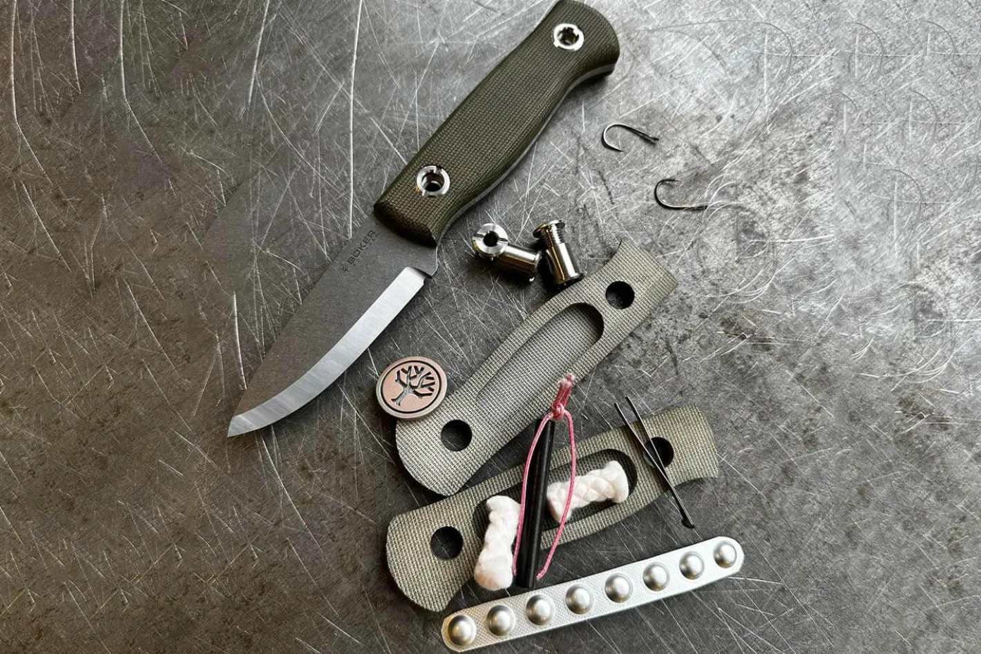 Zwei Streamer in der Wildnis? Messer statt Controller? Hungern statt Happy Slice Pizza? Klingt absurd, wird aber wahr: Der Hamburger Trymacs (29) und der Bonner Rumathra (27) treten als Team gemeinsam bei der kommenden Staffel von 7 vs. Wild an und stellen sich dem 14-tägigen Abenteuer in der Wildnis Kanadas. Die beiden Schwergewichte aus der deutschen Streaming-/Gaming Szene vereinen gemeinsam über 4 Millionen Follower auf Twitch (Trymacs 3,4 Mio., Rumathra 0,7 Mio.) und sind auch auf Youtube und Instagram reichweitenstark vertreten. Im Rahmen der intensiven Vorbereitung auf diese Grenzerfahrung spielte die Wahl der richtigen Ausrüstung – insbesondere, weil alle Gegenstände zusammen in einer 1L Nalgene-Flasche untergebracht werden müssen – eine elementare Rolle für die Beiden.Gemeinsam mit Rumathra, der uns mehrfachin unserer Solinger Manufaktur besuchte, entwickelten und bauten wir ein eigenes Messer, welches perfekt auf die Anforderungen und Gegebenheiten des anstehenden Outdoor-Abenteuers abgestimmt ist. Basis für die Neuentwicklung ist das von Dave Wenger entworfene Outdoor- und Bushcraft Messer Böker Plus Vigtig (s. Seite 105), welches aufgrund seiner Dimensionen (Gesamtlänge: 19,7 cm; Klingenstärke: 4 mm) nicht nur perfekt in die Flasche passte, sondern auf härteste Beanspruchungen ausgelegt ist. Die Wahl des Klingenstahls fiel auf Magnacut, der anders als die üblicherweise verwendeten Werkzeugstähle speziell für den Messerbau entwickelt wurde. Bei diesem als „Wunderstahl“ gefeierten Stahl ist es gelungen trotz des hohen Chromgehaltes von 10,7% und einer beeindruckenden Härtbarkeit von über 61-62 HRC ein sehr feines Gefüge und damit hohe Zähigkeit und Schocklastverträglichkeit zu erzielen.In Kombination mit dem True-Scandi Schliff trotzt die Klinge im Stonewash-Finish jeder anfallenden Herausforderung: von feinen Schneid- und Schnitzaufgaben zum Lagerbau und der Feuerholz-Vorbereitung, über Batoning und Hacken bis hin zur Wildversorgung. Um den Platz in der Nalgene Flasche optimal auszunutzen, wurden die beiden Griffschalen aus grünem Canvas Micarta etwas flacher gehalten als bei der Ursprungsversion und gewährleisten auch im nassen Zustand eine perfekte Handlage. Ein besonderes Highlight befindet sich im Inneren des Griffs. Anstelle von Hohlnieten lassen sich die beiden großen Schrauben mithilfe einer Münze einfach demontieren; zum Vorschein kommt ein gemessen an den Außendimensionen des Griffs üppiges Fach mit einer Tiefe von 14 mm, indem beispielsweise eine Pinzette ,Zunder, Kohletabletten, ein Angelset und Sicherheitsnadeln problemlos untergebracht werden können. Auch als skelettiertes Messerohne Griffschalen macht das vollständig in Solingen gefertigte Böker Vigtig vs. Wild eine gute Figur und unterstreicht die Vielseitigkeit des Sondermodells.Abgerundet wird der Lieferumgang durch eine kompakte Kydexscheide in schwarz mit Clip.