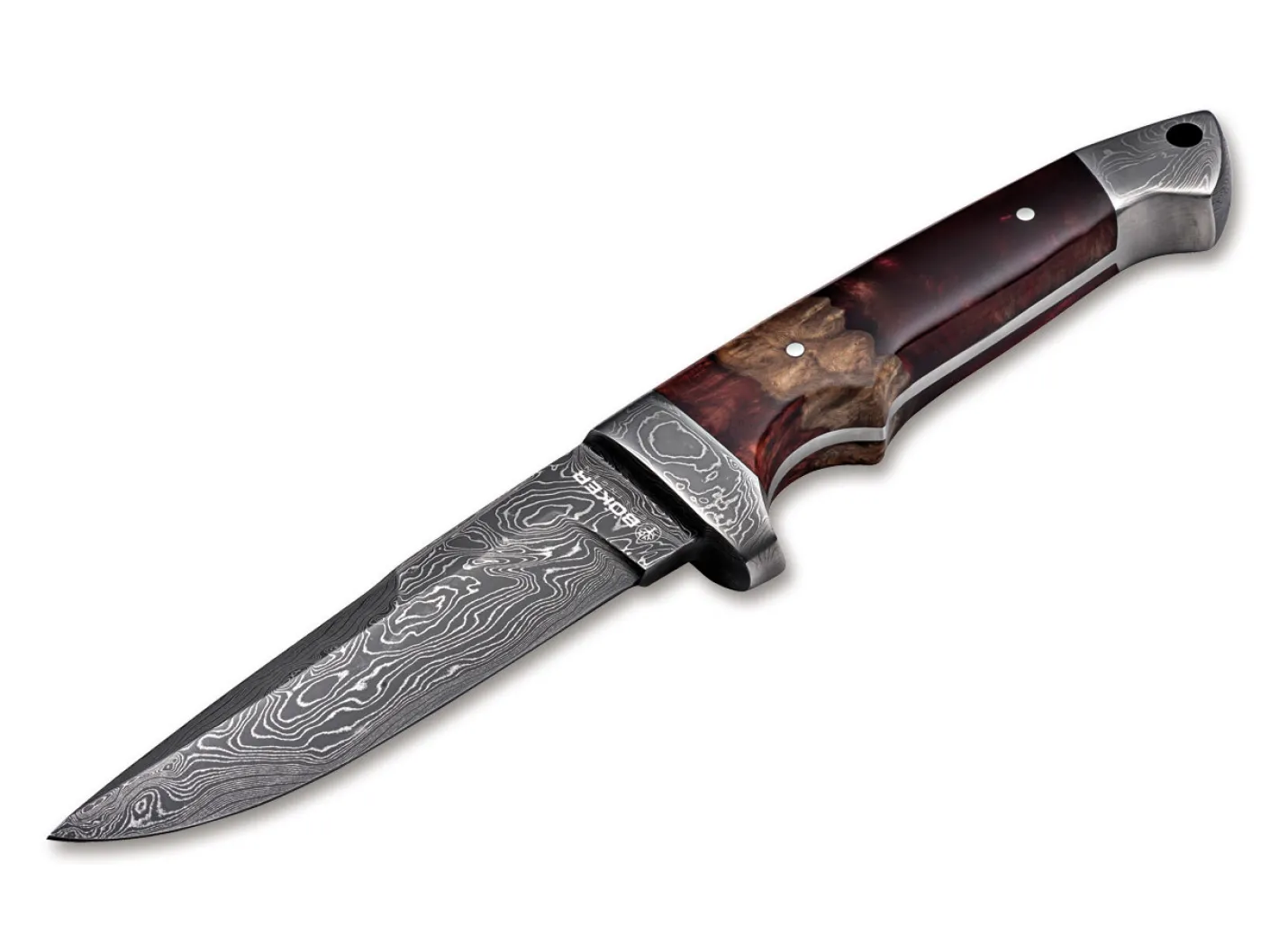 Das beliebte Böker Vollintegral ist seit vielen Jahren ein nicht mehr wegzudenkender Bestandteil unseres Sortiments, und gleichzeitig eine Ikone unter den Böker-Jagdmessern. Das stabile Messer wird in dieser besonders edlen Variante aus einem massiven Stück Damast im Gesenk geschmiedet, das Ausgangsmaterial besteht dabei aus 150 Lagen handgeschmiedetem, rostträgem Damast von Chad Nichols aus Mississippi. Die Klinge ist mit einem Flachschliff versehen, der die Stabilität maximiert. Die polierten Griffschalen mit atemberaubendem Tiefeneffekt bestehen aus einem Hybridmaterial, das aus zertifiziert importiertem, stabilisierten Amboinaholz und rotem Harz gefertigt wird.Die aufwendig konturierten Griffschalen werden zur Minimierung von Fertigungstoleranzen präzisionsgefräst, wodurch die Passgenauigkeit und die Ergonomie auf das höchstmögliche Niveau gehoben werden. Zudem sind der Griff insgesamt sowie die Oberflächen an Parierelement und Knauf angenehm gerundet. Mit passgenauer Lederscheide. Handgefertigt in der Böker Messer-Manufaktur Solingen. Die Auslieferung des auf nur 30 Stück limitierten Sammlermessers erfolgt mit individueller Seriennummer in einer edlen Holzschatulle mit Echtheitszertifikat.