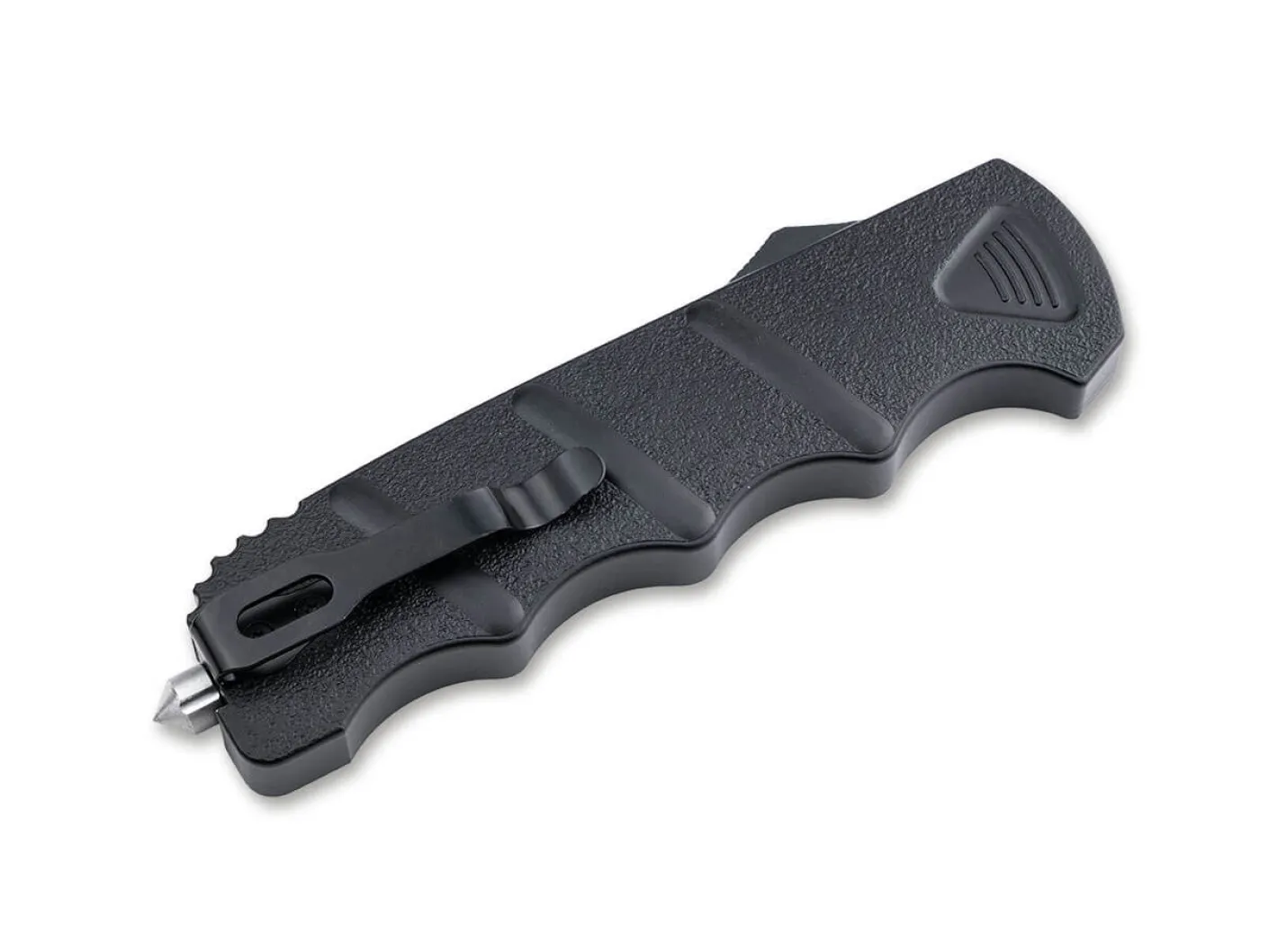 Ein Rettungswerkzeug muss zuerst und vor Allem einer zentralen Anforderung genügen: in einer Not- und Stresssituation muss es schnell, einfach sowie zuverlässig zu bedienen sein. Die technisch beste Lösung diesem Anspruch gerecht zu werden, bildet eine Konstruktion mit automatischer Schubklinge (englisch OTF, kurz für Out-of-The-Front) mit robust konstruierter und sorgfältig verarbeiteter Mechanik. Das stellt den Hersteller in Deutschland vor eine rechtliche Herausforderung, denn nach deutschem Waffengesetz sind OTF-Messer zunächst verboten (WaffG §1 Absatz 4 in Verbindung mit Anlage 1 Abschnitt 1 Unterabschnitt 2.1.1).Für das Rettungswerkzeug Böker Plus Rescue OTF liegt jetzt jedoch ein Feststellungsbescheid des Bundeskriminalamtes vor, der die Waffen- und Verbotseigenschaften dieses Werkzeuges aufgrund der Klingenform verneint. (Aktenzeichen SO13-5164.01-Z-543) Der Besitz und sogar das Führen dieses Tools in der Öffentlichkeit (in Deutschland) ist erlaubt.Herzstück des Rettungswerkzeugs ist ein klassischer Springmechanismus mit Daumenschieber, der die Klinge bei Betätigung kraftvoll hervorschnellen oder aber vollständig in den Griff zurückgleiten lässt. Der absolut zuverlässig arbeitende und bewährte Mechanismus mit kräftiger Feder wurde von den OTFs der Springmesserserie Kalashnikov übernommen, die Böker seit vielen Jahren im Ausland wie z.B. in Frankreich oder in den USA vertreibt.Die als Rettungshaken gestaltete Klinge mit abgerundeter Spitze verhindert versehentliche Verletzungen bei einer Fremd- oder Selbstrettung. Die Schneide mit Innenradius hinter der Spitze ermöglicht das schnelle und intuitive Kappen von Gurten, Schnur und Kernmantelseilen, sowie das sichere Auftrennen von Bekleidung verletzter Personen. Der bissige Wellenschliff in der zweiten Hälfte der Schneide ermöglicht auch das Trennen von dicken und verkrusteten Tauen. Aufgrund seiner extremen Schnitthaltigkeit im Zugschnittbereich wurde der rostträge Stahl D2 für die Klinge verwendet. Der Griffkörper ist für die erforderliche Griffsicherheit mit ausgeprägten Fingerrillen versehen und zusätzlich rutschfest texturiert.Der für den Griff verwendete Werkstoff Aluminium weist die erforderte Festigkeit bei gleichzeitig geringem Gewicht auf. Der unverzichtbare Glasbrecher zum Zertrümmern von Seitenscheiben wurde mit einem effektiven steilen Kegel versehen. Der Kern des Glasbrechers ist aus extrem hartem Wolframcarbid gefertigt. Für einen problemlosen Austausch bei Verschleiß wurde der Glasbrecher mit Schraubgewinde mit dem Griff verbunden. Ein Deep-Carry-Federstahl-Clip und Nylonetui. Ges. 22 cm. Kl. 9 cm. Stärke 2,8 mm. Gew. 143 g. Feststellungsbescheid des Bundeskriminalamtes:Feststellungsbescheid.pdf