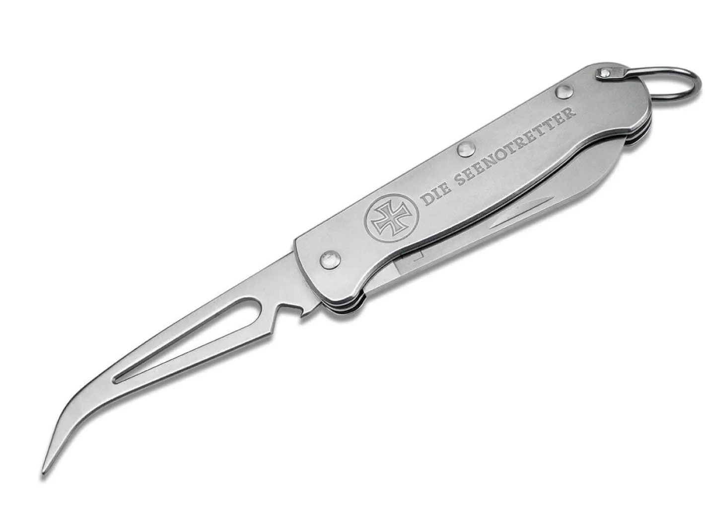 Zuständig für die Suche und Rettung in den deutschen Gewässern von Nord- und Ostsee – rund um die Uhr und bei jedem Wetter. Das leisten die Seenotretter. Keine Helden, sondern Profis – so bescheiden und gleichzeitig streng gegen sich selbst ist ihr Motto.Seit der Gründung vor über 158 Jahren ist der offizielle rechtliche Name Deutsche Gesellschaft zur Rettung Schiffbrüchiger (DGzRS). Von der Bundesrepublik Deutschland ist dieser Gesellschaft die hoheitliche Aufgabe des maritimen Such- und Rettungsdienstes in den Gebieten Nord- und Ostsee übertragen. Sie gewährleisten heute einen der modernsten und professionellsten Seenotrettungsdienste der Welt. Das oberste Ziel ist die schnelle und effektive Rettung von Menschenleben. Um dieses Ziel frei von Fremdeinfluss und anderen Interessen zu halten, setzten die Seenotretter von Anfang an auf Unabhängigkeit und verzichten bewusst auf die Inanspruchnahme öffentlicher Gelder. Die Finanzierung beruht ausschließlich auf freiwilligen Spenden. Die Rettung von Menschenleben unter Einsatz des eigenen Lebens erfolgt überwiegend durch freiwillige ehrenamtlich engagierte Seenotretter.In Hinblick auf diese Offshore-Profis haben wir das Böker Plus Seenotretter 01 entwickelt, das die hohen Anforderungen auf hoher See erfüllt. Als klassisches No-Nonsens-Takelmesser richtet es sich an professionelle und private Anwender auf maritimen- und Binnengewässern oder Menschen, die viel mit Tauen arbeiten. Es besteht vollständig aus rostfreiem Edelstahl. Die Hauptklinge aus 1.4116 ist mit einer halben Welle versehen, um verkrustete Taue und Gurte zu durchtrennen. Der Marlspieker (zum Aufstechen verhärteter Knoten) enthält zusätzlich Schäkel- und Flaschenöffner. Beide Klingen werden durch einen robusten und schmutzunempfindlichen Slip-Joint in Position gehalten. Für Haltbar- und Zuverlässigkeit wurde auf massive Domehead-Nieten anstelle von Schrauben gesetzt. Die vordere Schale ist mit dem bekannten Logo der Seenotretter mit Hansekreuz geprägt. Das Tragen wird durch einen Deep-Carry-Clip (Tip-Up/r) erleichtert. Vor Verlust schützt eine großzügig dimensionierte Reepschnuröse. Böker spendet 5€ vom Verkaufserlös jedes Messers an die Seenotretter der DGzRS.