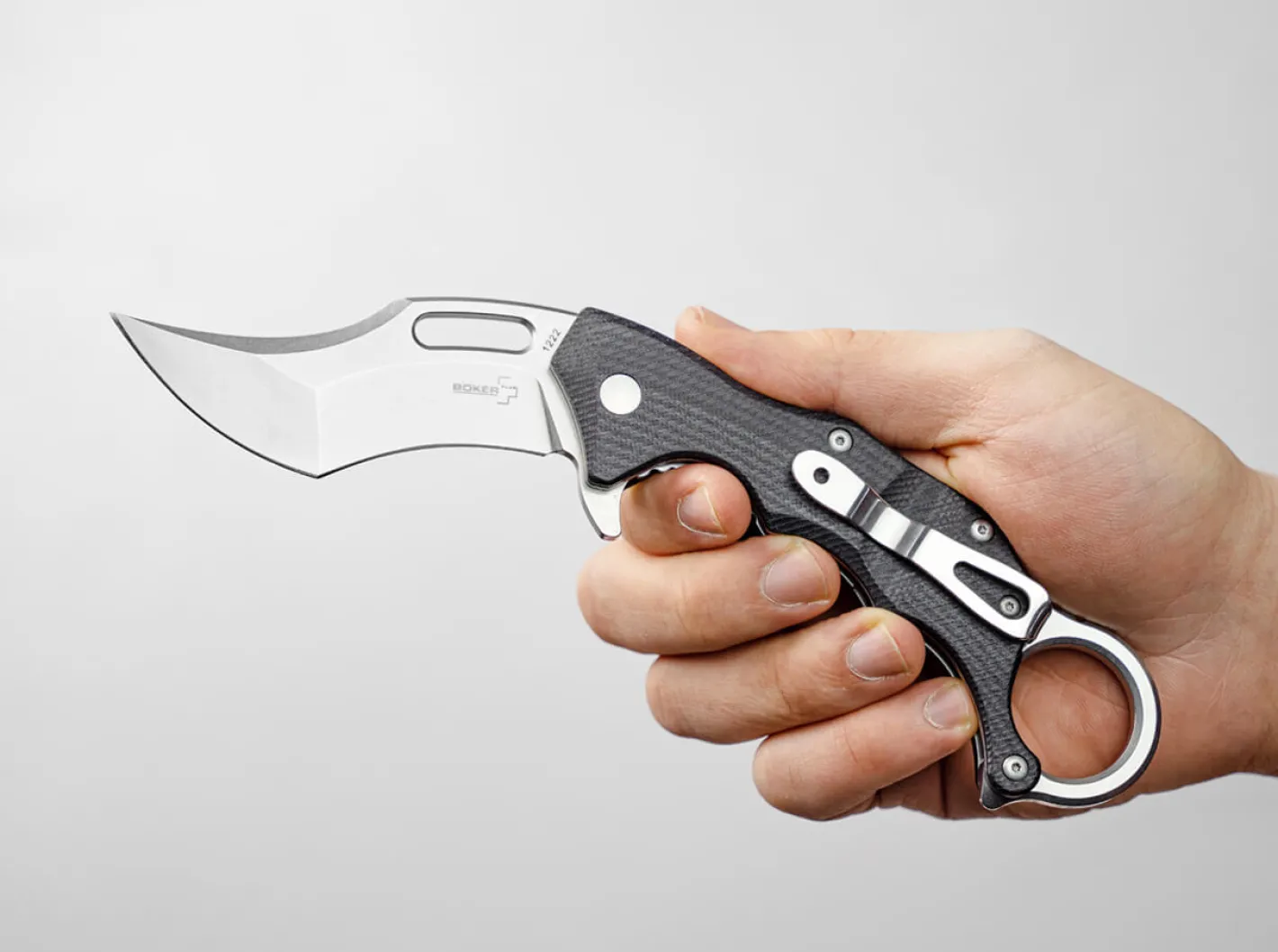Die Entwürfe von Boris Manasherov überzeugen durchgehend durch ihre hohe Durchdachtheit, die perfekte Ergonomie und das ausdrucksstarke Design. Das überaus erfolgreiche Böker Plus Wildcat bekommt mit dem Wildcat XL einen großen Bruder zur Seite gestellt, der mit den gleichen Vorzügen punktet wie das Original, aber mit noch etwas mehr Handfestigkeit überzeugt. Für die kugelgelagerte Klinge kommt auch hier D2 zum Einsatz, während die Beschalung aus G10 besteht. Die Verriegelung erfolgt per Linerlock. Das Kerambit überzeugt mit perfekter Handlage, und die Klinge öffnet wahlweise weich per Daumenloch, oder schnell und nachdrücklich per Flipper. Der umsetzbare Clip (l/r) sorgt für einen tiefen Sitz in der Tasche, der den Ring jedoch oberhalb des Taschensaumes für ein schnelles Ziehen zugänglich lässt.