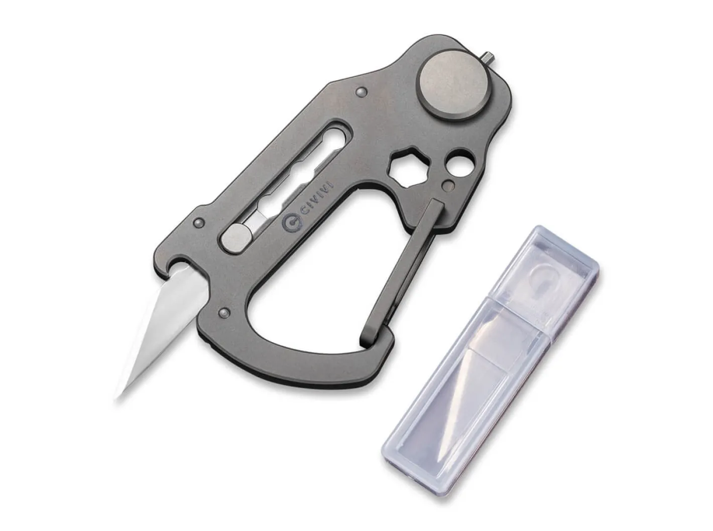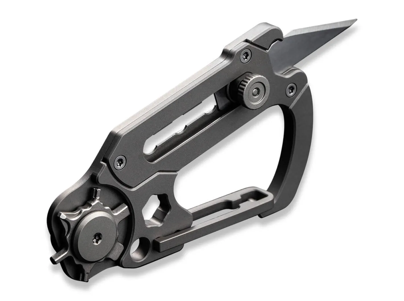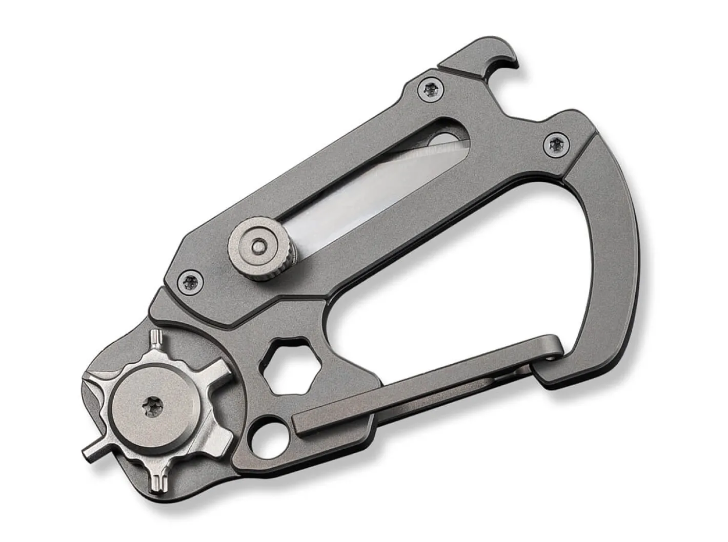Hier ist der Name Programm. Das vielseitige und kompakte Multitiool hat viele Gesichter und präsentiert sich als praktischer Helfer im Alltag. Seine Konstruktion aus grauem Titan enthält einen Karabiner sowie eine herausschiebbare Klinge aus 9Cr18MoV. Das kleine Rad im hinteren Bereich ist u.a. mit Inbus und Torx ausgestattet. Lieferung mit 3 Klingen.
