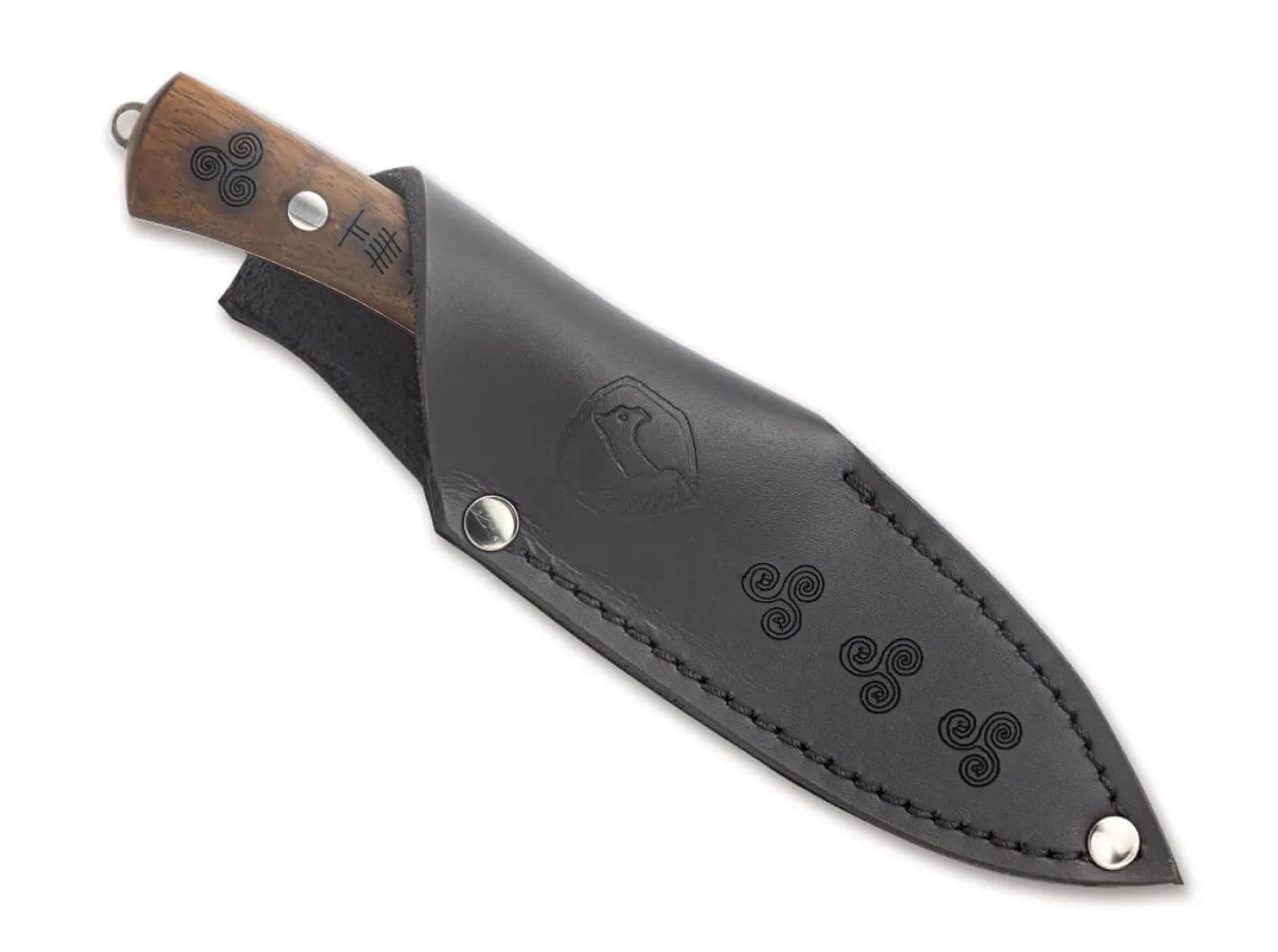 Das von Walter A. Matthews gefertigte Druid Knife ist von den alten und mystischen Bewohnern der Wälder inspiriert und überzeugt mit einem Design, das auf den modernen Naturliebhaber zugeschnitten ist. Die Klinge aus 1095 Kohlenstoffstahl und der dezent geschwungene Griff aus Walnussholz sind eine gelungene Mischung aus Form und Funktion. Keltische Symbole zieren Klinge als auch Griff. Mit Fangriemenöse und hochwertiger Lederscheide.