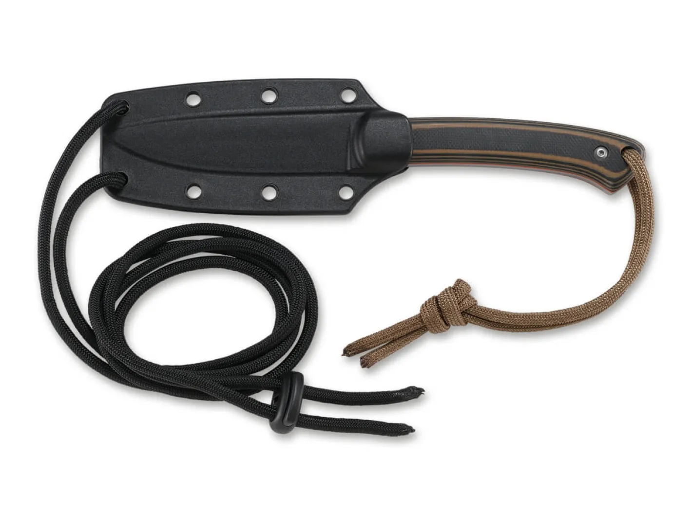 Das feststehende Messer aus der Feder von Alan Folts überzeugt mit seiner Leichtbauweise bei einer gleichzeitig hohen Stabilität. Die flachgeschliffene Klinge aus 8Cr13MoV im Satinfinish verfügt über eine Teilriffelung auf dem Klingenrücken und verleiht dem Messer damit eine gute Handhabung bei schwierigen Schneidarbeiten. Der schwarze Griff aus G10 liegt sicher in der Hand ist mit braunen Streifen akzentuiert. Mit Fangriemenöse, braunem Lanyard und Kunststoffscheide.