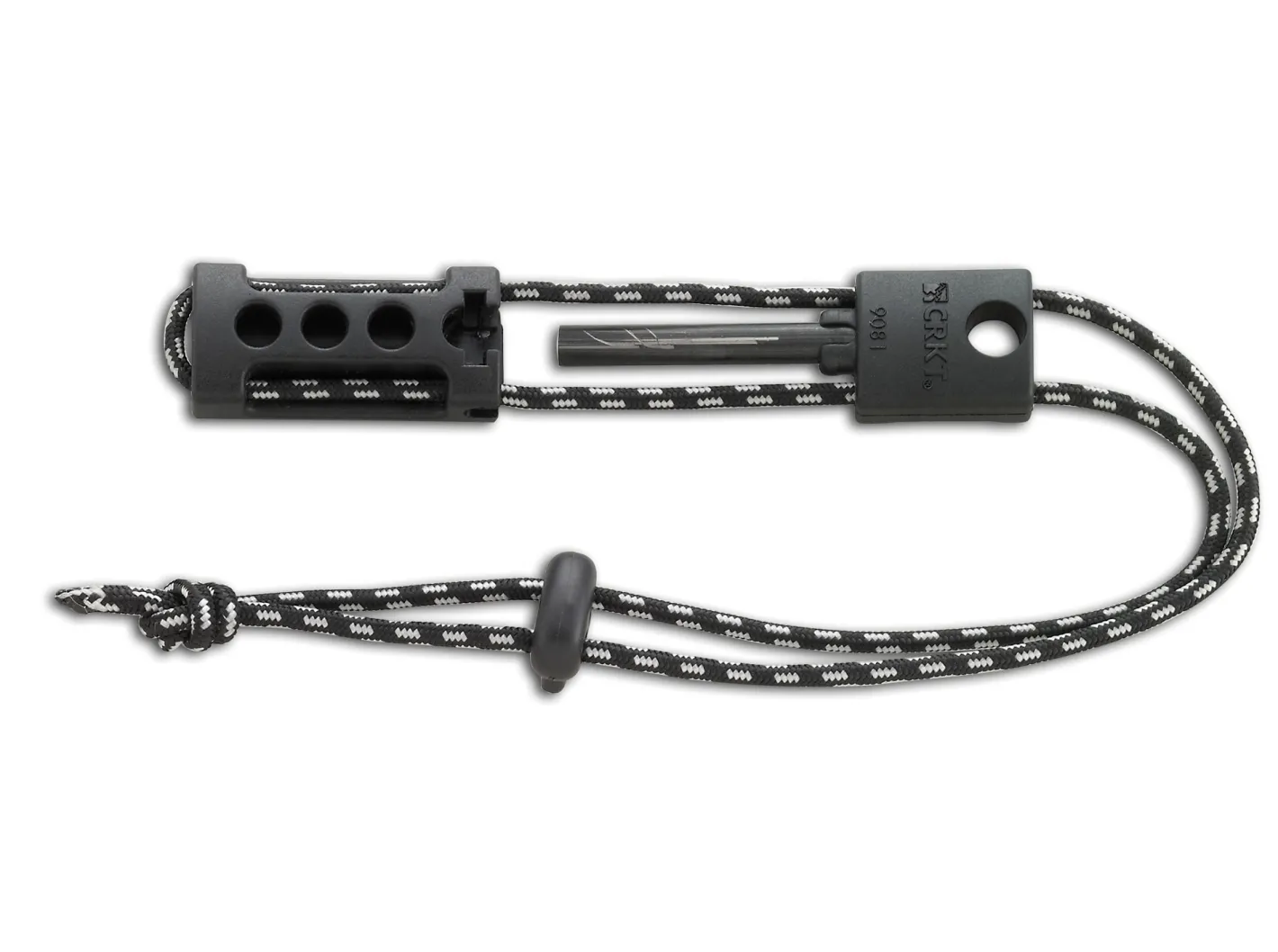 Dieses kleine und handliche Hilfsmittel stellt zwei wichtige Outdoor-Werkzeuge praktisch unverlierbar jederzeit zur Verfügung, einen Tungsten Carbide Schärfer und einen Magnesium- Feuerstarter.