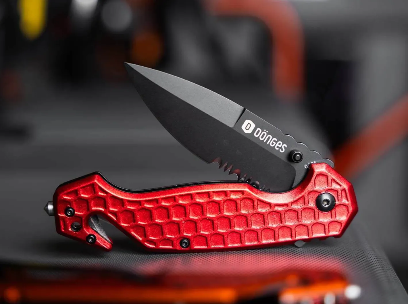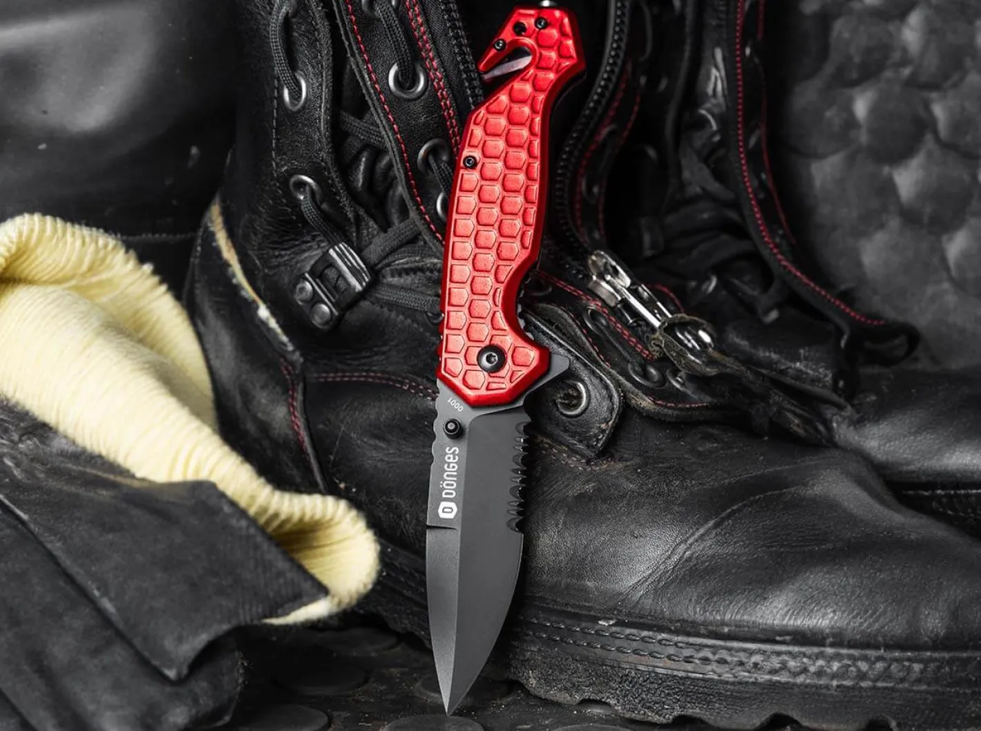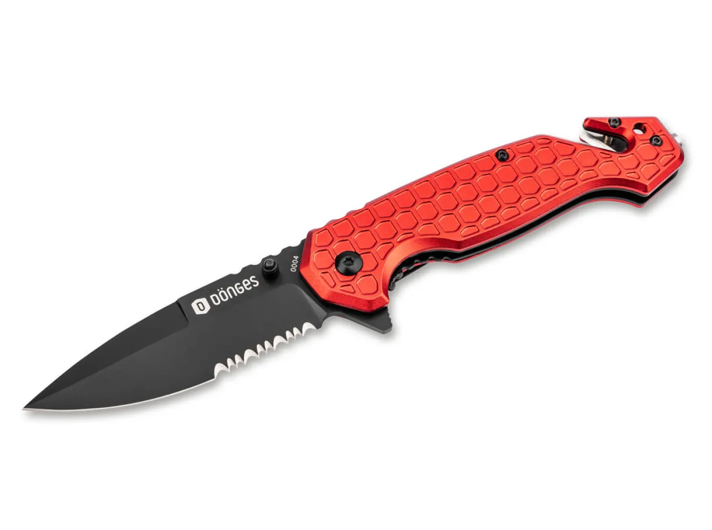 Die Dönges GmbH und Co. KG ist der führende Systemlieferant für Feuerwehr, Rettungsdienste, Behörden, Bundeswehr und Industrie mit Sitz im Herzen der deutschen Werkzeugproduktion, dem Bergischen Land. Die beiden benachbarten Unternehmen Dönges und Böker verbindet eine jahrzehntelange Zusammenarbeit. Erstmalig haben die Marktführer ihrer Branche ihre gesamte Kompetenz zusammengeschlossen, um gemeinsam eine von Grund auf neu entwickelte Rettungsmesser-Serie für den professionellen Anwender zu erschaffen. Dönges hat hierzu seine Erfahrung als führender Ausrüster, Böker seine über 150-jährige Erfahrung in der Entwicklung und Herstellung von Messern beigetragen. Das Ergebnis ist eine ausdifferenzierte Produktserie für die vier Aufgabenbereiche Brandbekämpfung, Rettung, Law Enforcement und Militär. Die Modellreihe ist in drei User-Levels gegliedert: Basic, Professional und Expert. Jedes einzelne der insgesamt 8 Rescue-Tools ist bis ins letzte Detail auf den einzelnen Anwender und seine speziellen Erfordernisse zugeschnitten. Die Dönges Basic Serie ist bewusst in einer moderaten und gängigen Taschenmessergröße gehalten. So kann das Messer im Alltag geführt werden und auch allgemeine Schneidaufgaben erledigen. Im Notfall ist es als professionelles Rettungswerkzeug so immer griffbereit im unvorhergesehenen Fall des Falles. Die starken gemeinsamen Merkmale aller drei Modelle sind die eloxierten Griffschalen aus Flugzeugaluminium 6061 mit griffiger Dönges-Wabenstruktur, Klingen aus zähem rostfreiem Edelstahl 440A mit bissiger halber Welle und kugelgelagerten Achsen, Glasbrecher, Gurtschneider sowie einem zuverlässigen Stahlclip zur Trageweise Tip-Down R.Das Messer für Brandbekämpfer aus der Basic-Serie ist mit einer universell einsetzbaren Spearpoint-Klinge ausgestattet, die wahlweise per Fingerflipper oder Daumen-Pin geöffnet werden kann. Die 6061-Aluminiumschalen sind Feuerwehr-Rot eloxiert.