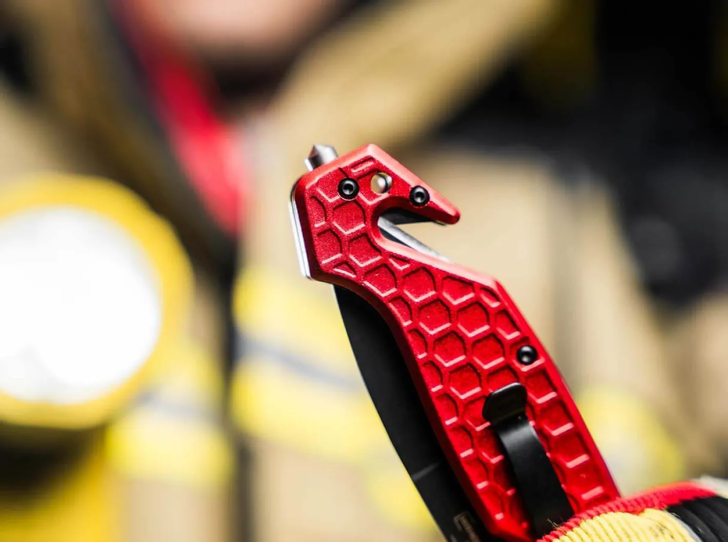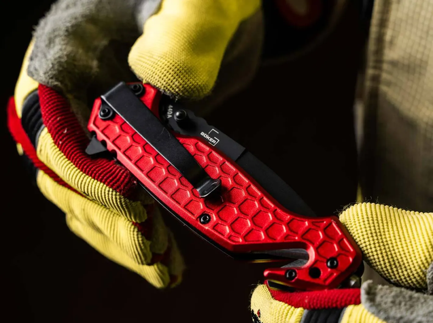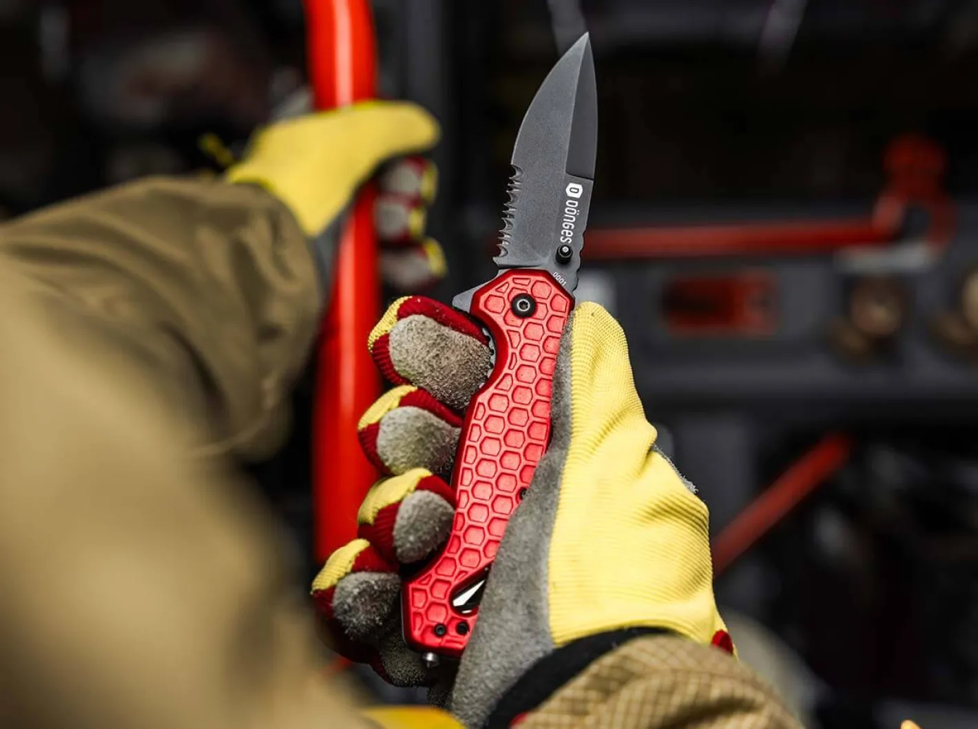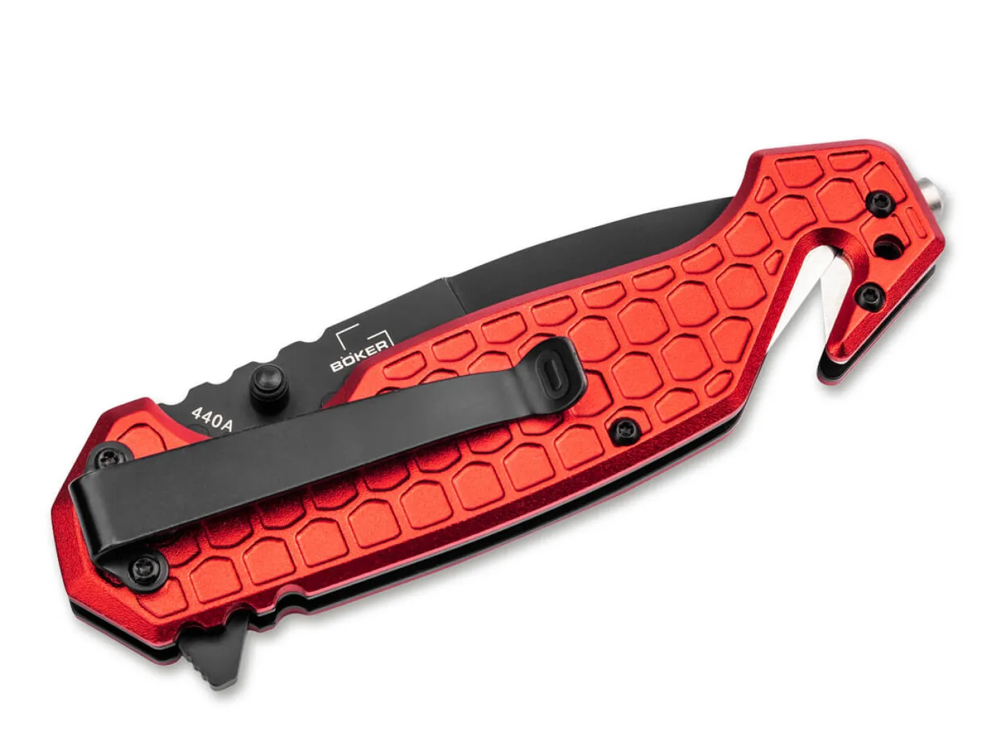 Die Dönges GmbH und Co. KG ist der führende Systemlieferant für Feuerwehr, Rettungsdienste, Behörden, Bundeswehr und Industrie mit Sitz im Herzen der deutschen Werkzeugproduktion, dem Bergischen Land. Die beiden benachbarten Unternehmen Dönges und Böker verbindet eine jahrzehntelange Zusammenarbeit. Erstmalig haben die Marktführer ihrer Branche ihre gesamte Kompetenz zusammengeschlossen, um gemeinsam eine von Grund auf neu entwickelte Rettungsmesser-Serie für den professionellen Anwender zu erschaffen. Dönges hat hierzu seine Erfahrung als führender Ausrüster, Böker seine über 150-jährige Erfahrung in der Entwicklung und Herstellung von Messern beigetragen. Das Ergebnis ist eine ausdifferenzierte Produktserie für die vier Aufgabenbereiche Brandbekämpfung, Rettung, Law Enforcement und Militär. Die Modellreihe ist in drei User-Levels gegliedert: Basic, Professional und Expert. Jedes einzelne der insgesamt 8 Rescue-Tools ist bis ins letzte Detail auf den einzelnen Anwender und seine speziellen Erfordernisse zugeschnitten. Die Dönges Basic Serie ist bewusst in einer moderaten und gängigen Taschenmessergröße gehalten. So kann das Messer im Alltag geführt werden und auch allgemeine Schneidaufgaben erledigen. Im Notfall ist es als professionelles Rettungswerkzeug so immer griffbereit im unvorhergesehenen Fall des Falles. Die starken gemeinsamen Merkmale aller drei Modelle sind die eloxierten Griffschalen aus Flugzeugaluminium 6061 mit griffiger Dönges-Wabenstruktur, Klingen aus zähem rostfreiem Edelstahl 440A mit bissiger halber Welle und kugelgelagerten Achsen, Glasbrecher, Gurtschneider sowie einem zuverlässigen Stahlclip zur Trageweise Tip-Down R.Das Messer für Brandbekämpfer aus der Basic-Serie ist mit einer universell einsetzbaren Spearpoint-Klinge ausgestattet, die wahlweise per Fingerflipper oder Daumen-Pin geöffnet werden kann. Die 6061-Aluminiumschalen sind Feuerwehr-Rot eloxiert.