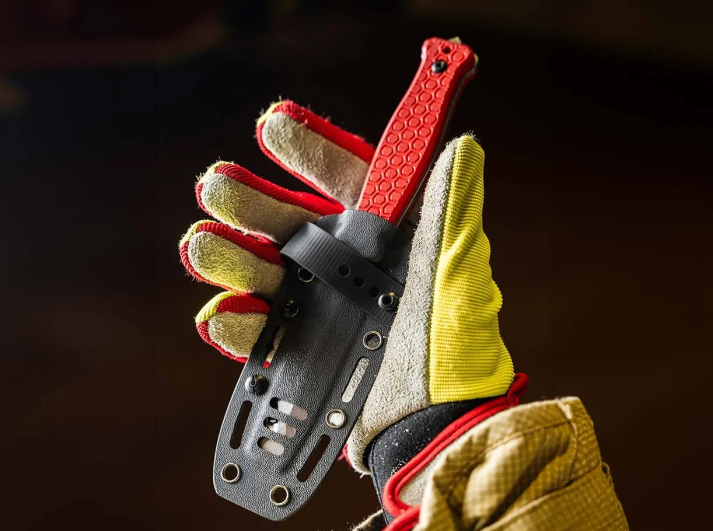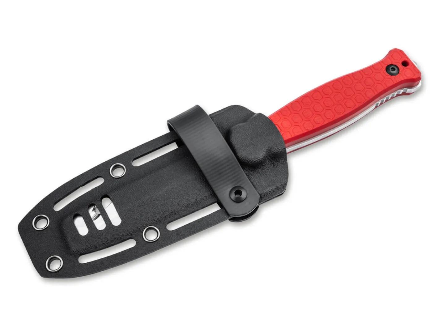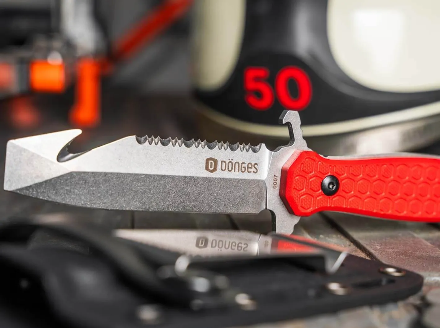 Die beiden Messer der Dönges-Expert-Serie sind spezialisierte Tools für den harten und fordernden Rettungs-Einsatz. Gemeinsam sind den beiden Messern die Beschalung aus rotem G10 mit griffsicherer Dönges-Wabenstruktur, Klingen aus schnitthaltigem und rostträgem Stahl D2 sowie einem Glasbrecher. Beide Messer verfügen über mehrere Schneiden, die kompromisslos auf das Schneiden von Tauen, Gurten und Bekleidung verletzter Personen abgestimmt sind. Die Expert-Serie besteht aus einem Schließmesser mit zwei Klingen und einem feststehenden Messer.Das einzige Fixed-Blade der Serie verfügt über eine zweischneidig geschliffene Klinge. Die Unterseite ist auf ganzer Länge glattgeschliffen. Auf der Rückseite befindet sich ein bissiger Wellenschliff für faserige Materialien. Hinter der Klingenspitze am Rücken befindet sich ein Gurtschneider. Die Spitze ist als stumpfe Hebelspitze ausgelegt, dabei jedoch bewusst dünn ausgeschliffen. Auf diese Weise kann sie mit wenig Kraft auch in sehr schmale Fugen getrieben werden wie etwa die Spalten von zugenagelten Kisten oder zwischen Rahmen und Tür von verklemmten Sicherungskästen. Die Fulltang-Konstruktion verfügt über ausgeprägte Parier-Elemente von denen das obere als integrierter Kapselheber ausgelegt ist. Das Messer hat einen sicheren passgenauen Sitz in der mitgelieferten Kydex-Scheide und kann zusätzlich über einen abschraubbaren Druckknopfriegel aus faserverstärktem Synthetik-Material gesichert werden. Wahlweise kann die Scheide mit einem modularen Clip aus rostfreiem Edelstahl oder durch die mit Nieten verstärkten Löcher mit Kabelbindern an der Ausrüstung befestigt werden.