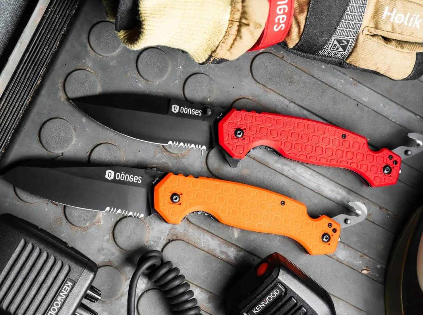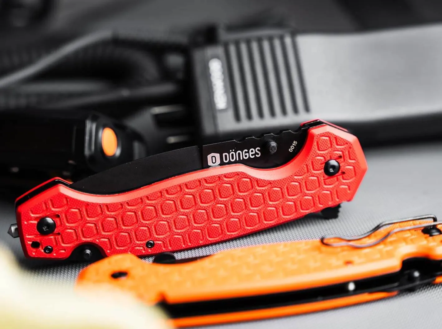 Diese Messer sind mit einer durchschnittlichen Klingenlänge von 11,6 cm speziell für die Verwendung mit Handschuhen (auch schweren Hitzeschutzhandschuhen) dimensioniert. Die Griffschalen sind einheitlich aus hitzebeständigem G10 mit rutschfester Dönges-Wabenstruktur versehen. Sämtliche Messer besitzen einen 4-fach umsetzbaren Draht-Clip (für die Trageweisen Tip-Up, Tip-Down r/l), Klingen aus schnitthaltigem D2 mit kugelgelagerter Achse, einer Verzahnung an der Klingenbasis für faseriges Material, einen versenkbaren Gurtschneider sowie einen Glasbrecher.Auch in der Professional-Serie ist das Modell für Brandbekämpfer mit einer universell einsetzbaren Spearpoint-Klinge ausgestattet, die wahlweise per Fingerflipper oder Daumen-Pin geöffnet werden kann. Die Dimensionen sind hier jedoch größer als in der Basic-Linie und der Gurtschneider ist im Griff versenkbar. Die mit Dönges-Wabenstruktur gefrästen Griffschalen sind aus rotem G10.