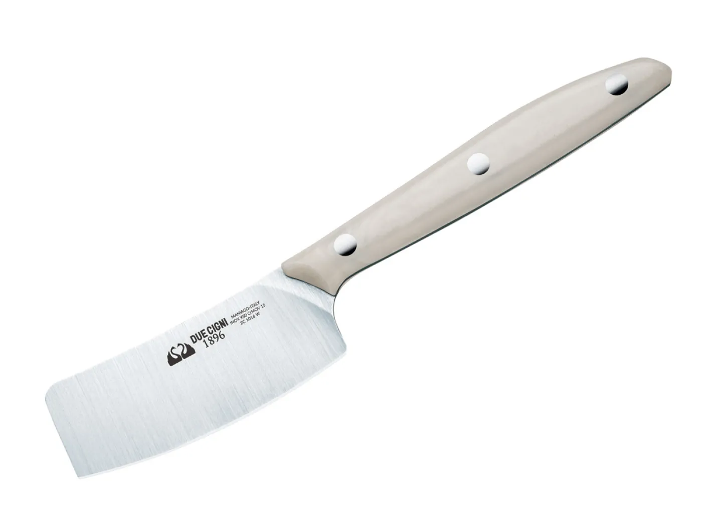 Mit der Serie 1896 stellt Due Cigni eine besonders hochwertige Küchenmesserserie vor, die das Sortiment des Herstellers aus der traditionellen Messerstadt Maniago krönt. Mit Griffen aus widerstandsfähigem weißem POM liegen die Messer ausgezeichnet in der Hand, wobei die klassische Vernietung die optische und haptische Balance perfektioniert. Dieses Käsemesser eignet sich vor allem für das Schneiden von Weichkäse. Für die Klinge kommt der bewährte X50CrMoV15 zum Einsatz, der Schnitthaltigkeit und Korrosionresistenz perfekt vereint.